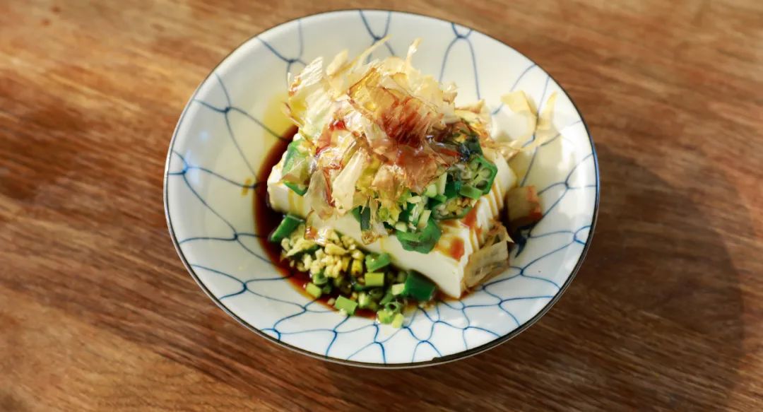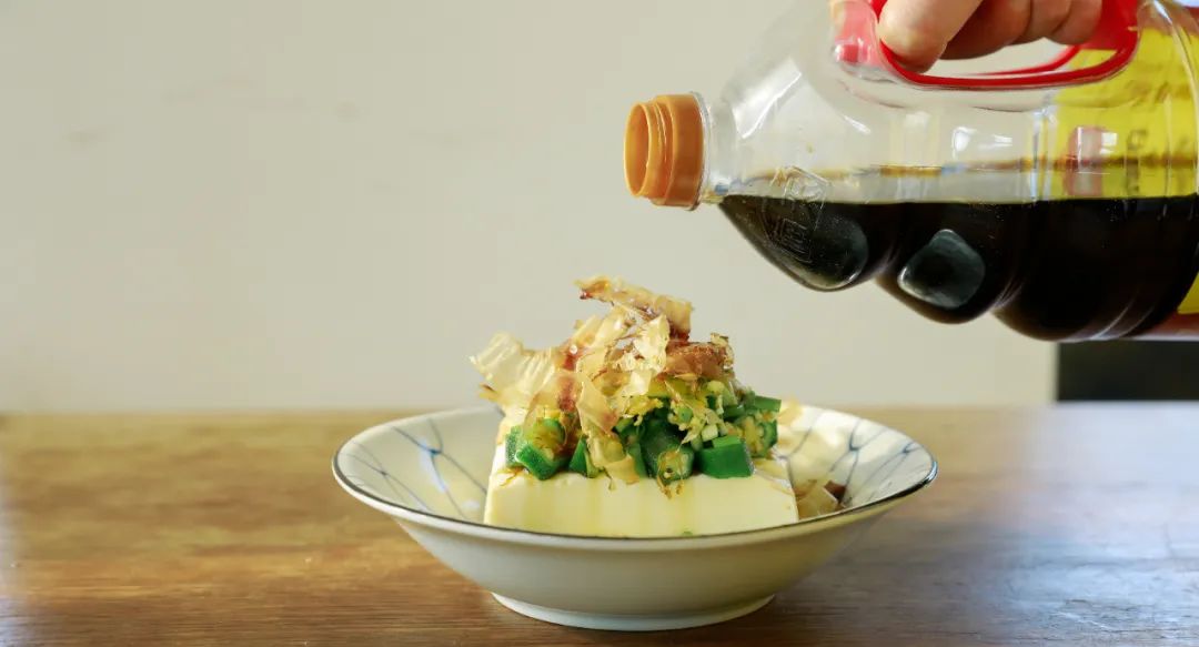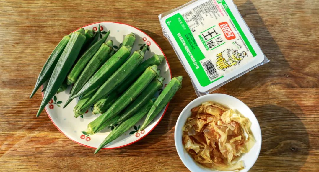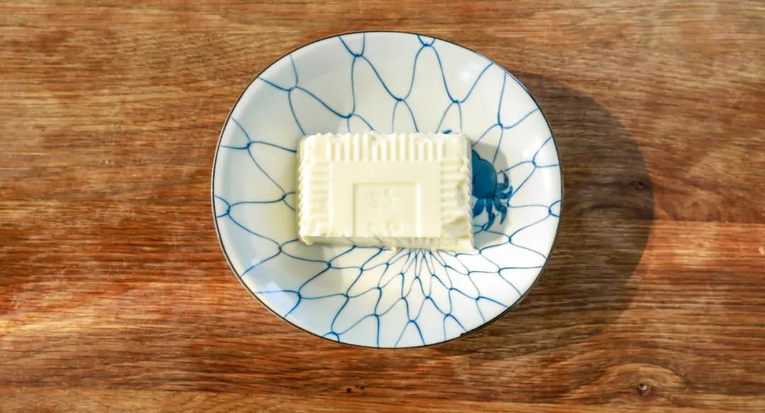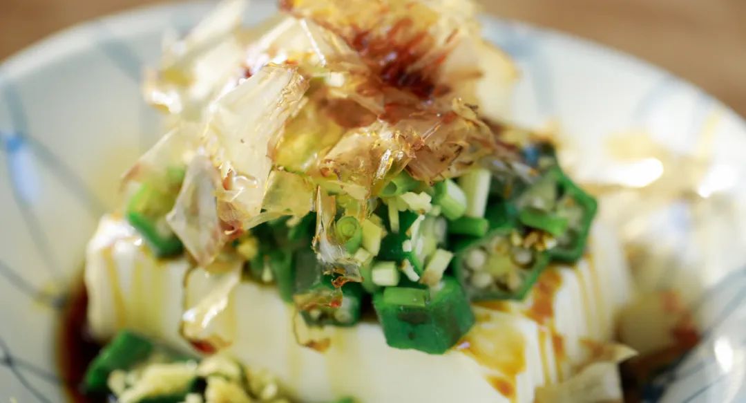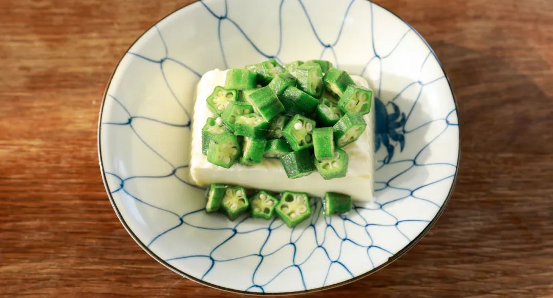 3.制作和风秋葵豆腐:将豆腐整块放入碗中。