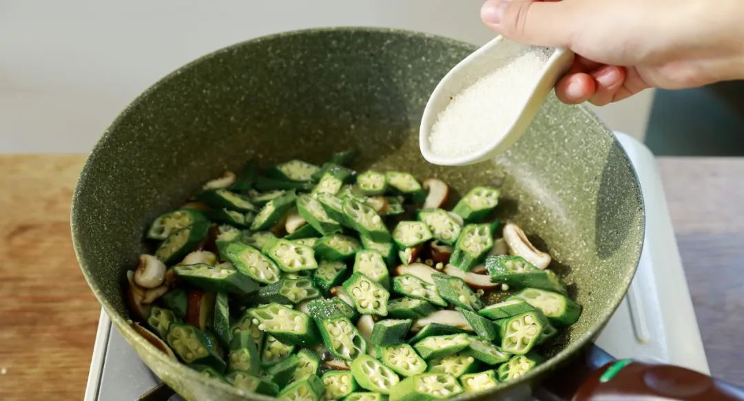 再把秋葵下锅,加盐翻炒,稍微加一点水。