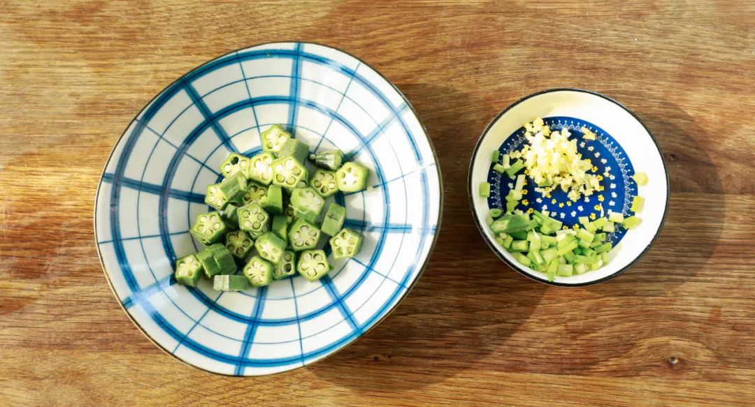 1.处理食材:把秋葵切成小圈,小葱切成葱花,姜切成末。