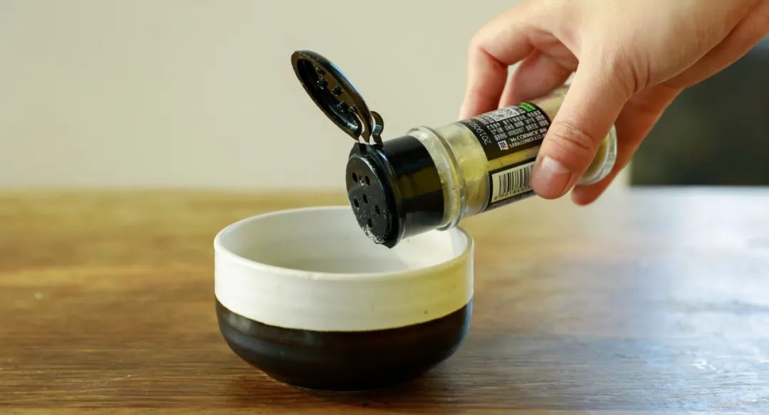 2.调制料汁:往小碗中加入一勺半的生抽、一勺水、几滴醋还有白胡椒粉。