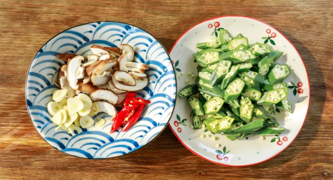 1.处理食材:秋葵洗干净后切成斜片,把蒜、香菇还有红辣椒都切片。