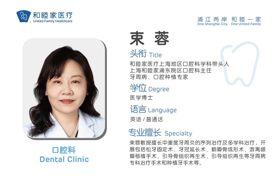 束蓉教授是和睦家的老朋友,在加入和睦家之前,以特聘专家的身份持续为和睦家的患者提供高品质的、符合国际标准的牙周病、种植牙等诊疗服务,深受患者信任与欢迎。