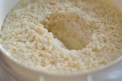 2、白糯淘洗两遍之后,加入糯米体积两倍量的冷水浸泡2-4个小时。夏天天气较热,时间不宜过长,浸泡到用手可捻碎米粒即可。