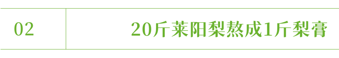 选用100%莱阳梨为原料,每20斤莱阳梨,经过几十道工序,仅熬制出1斤纯梨膏。不添加水及任何添加剂,熬出来的膏体饱满,是清亮的红褐色,无杂质无沉淀。