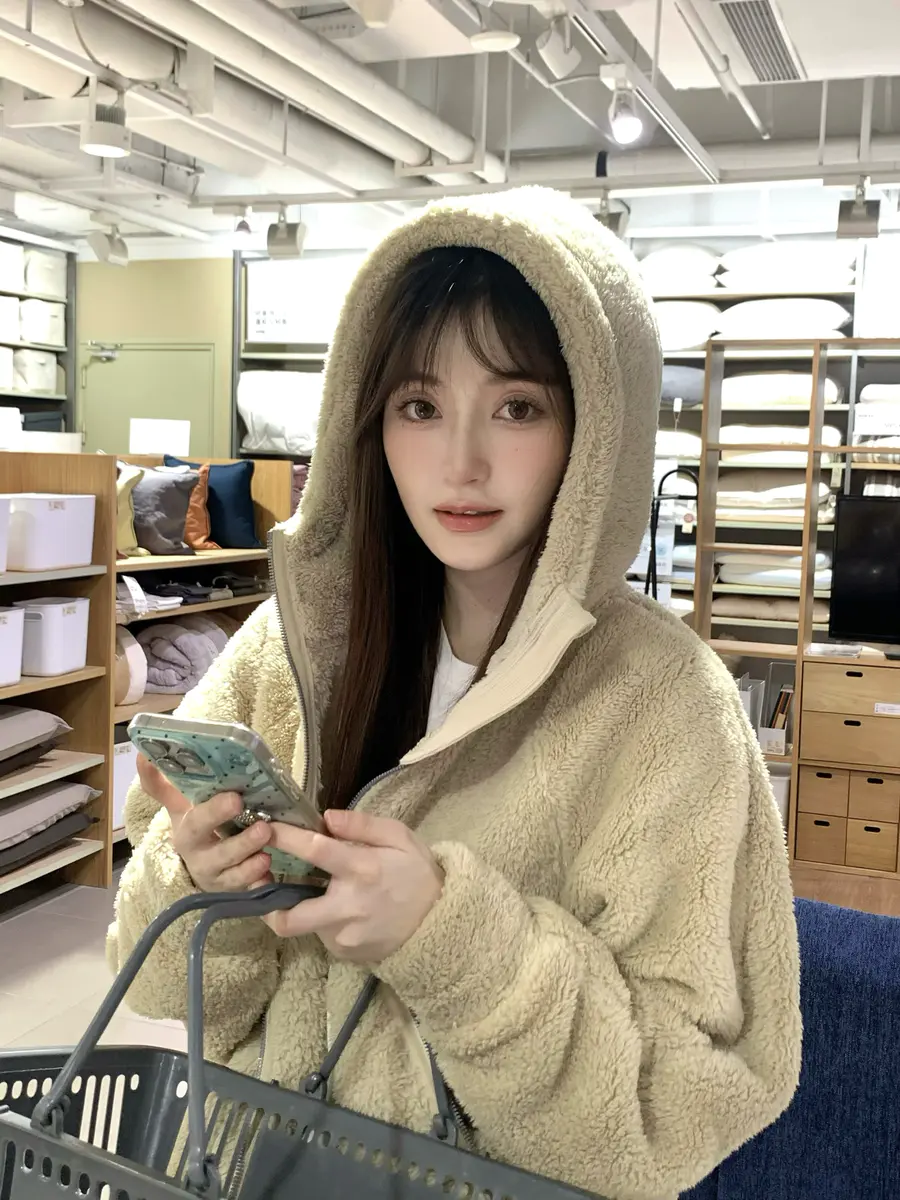 毛茸茸的短款外套,亲肤保暖,这么一件也能搞定~