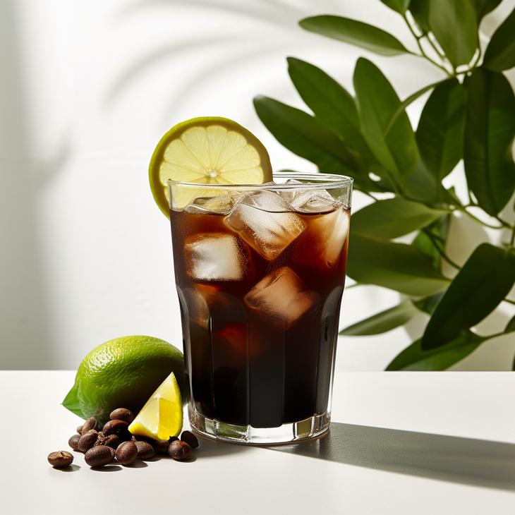 3、杯子里加入半杯苏打水,倒入咖啡液, 加入青柠片装饰完成。