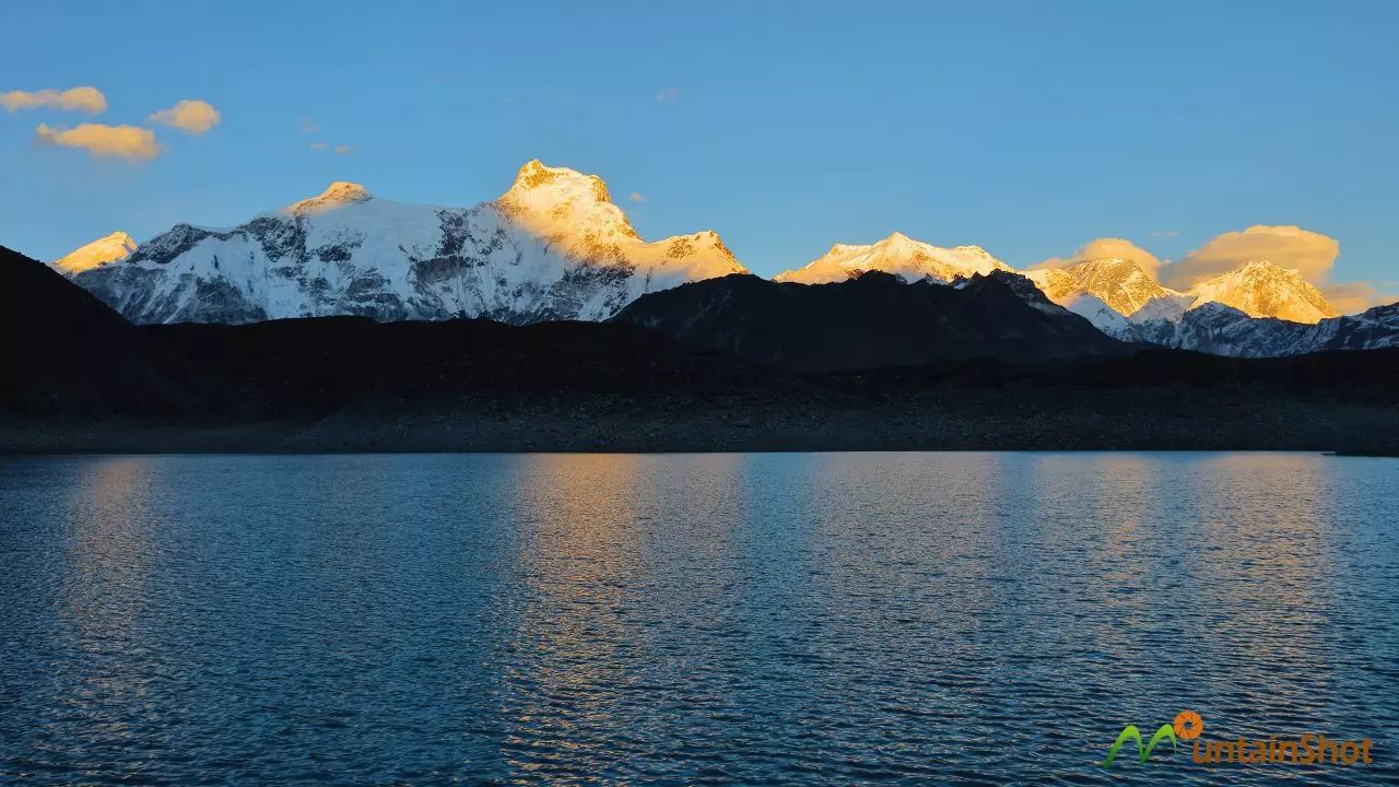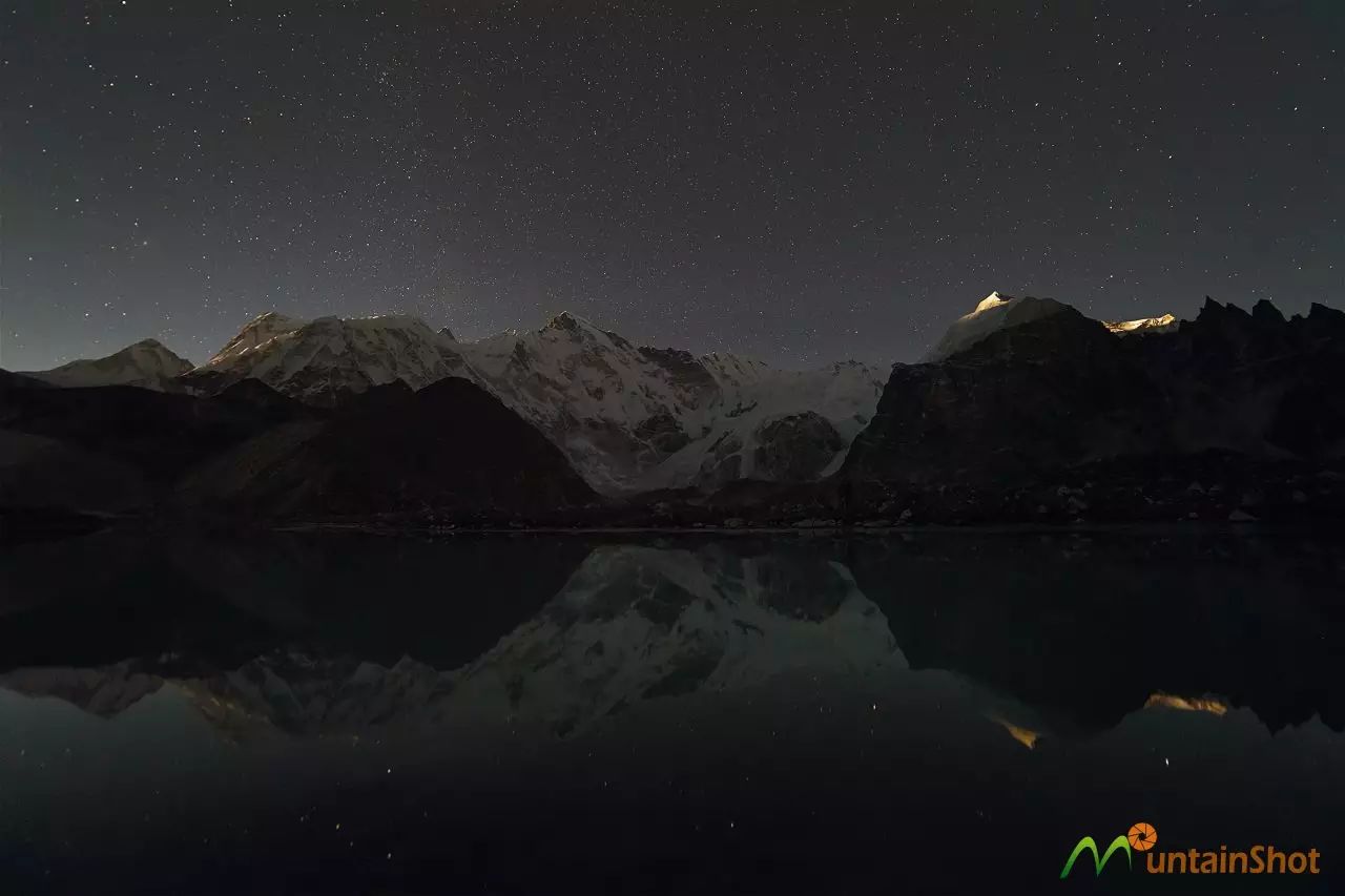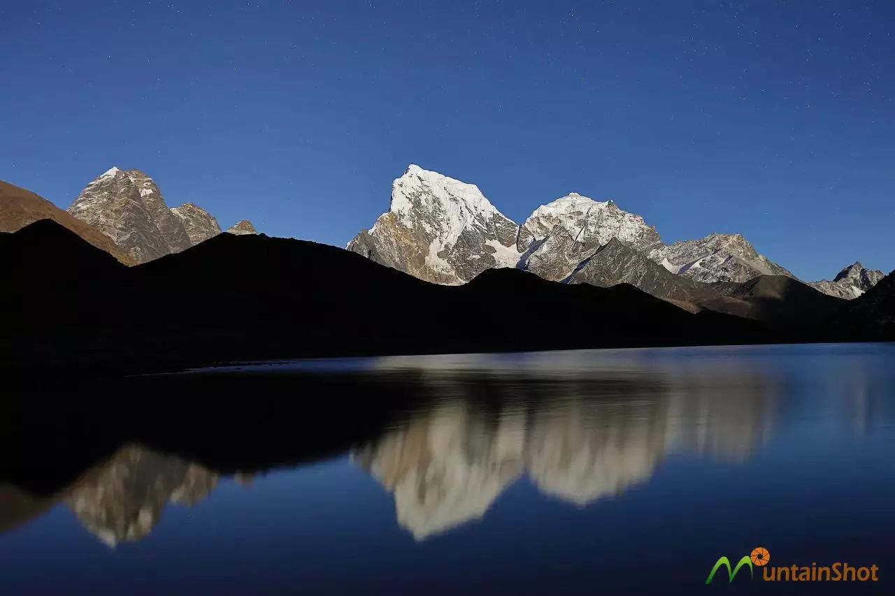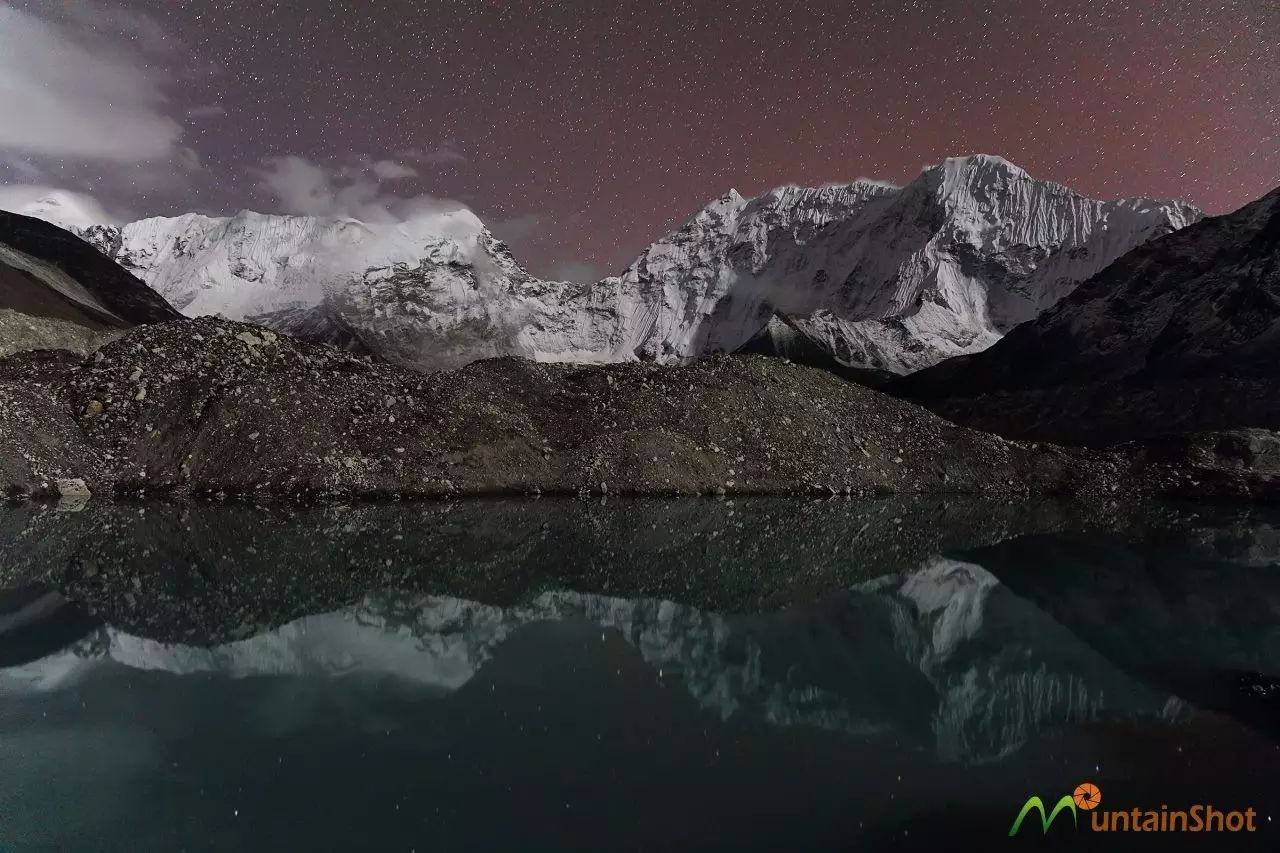 从Gokyo第三湖南岸北望,左边的山峰便是卓奥友,右边露出一角的是格重康,图中灯火阑珊的建筑便是位于第三湖东北角的Gokyo驿站,有很多相当漂亮。