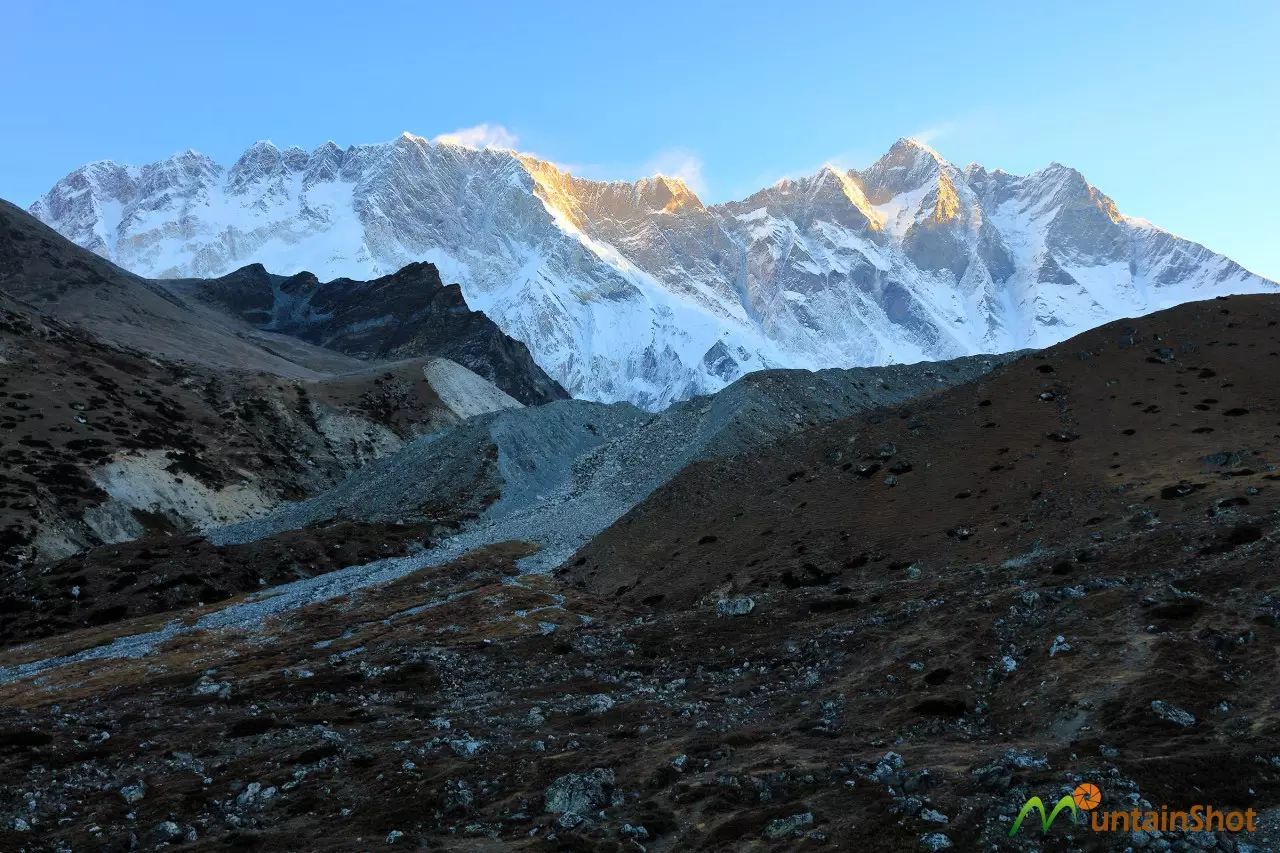 下图为Chhukhung视角的努子峰-洛子峰南坡,图中左下方的小路通往EBC三大观景平台之一的Chhukhung Ri,但我感觉Chhukhung Ri的视野会被前面的山峰遮挡,而且洛子峰视角有点偏,因此没有上去,现在却有点后悔。