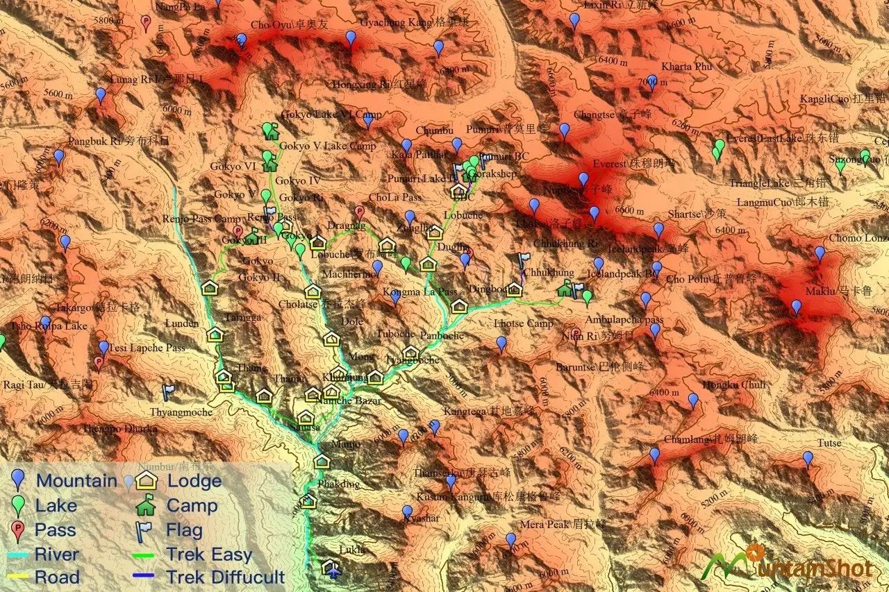 请参照下图理解整个Sagarmatha公园的徒步路线和山峰分布情况,需要说明的是本地图所标注的徒步路线和观景地点只能表示该地理位置是可以到达的,但并不十分精确,也不代表该路线和观景角度是最佳的,敬请理解。