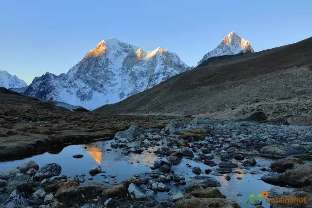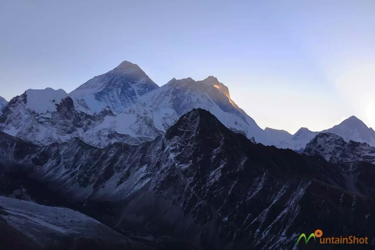 (Gokyo Lake V附近视角的珠峰和洛子峰↑)