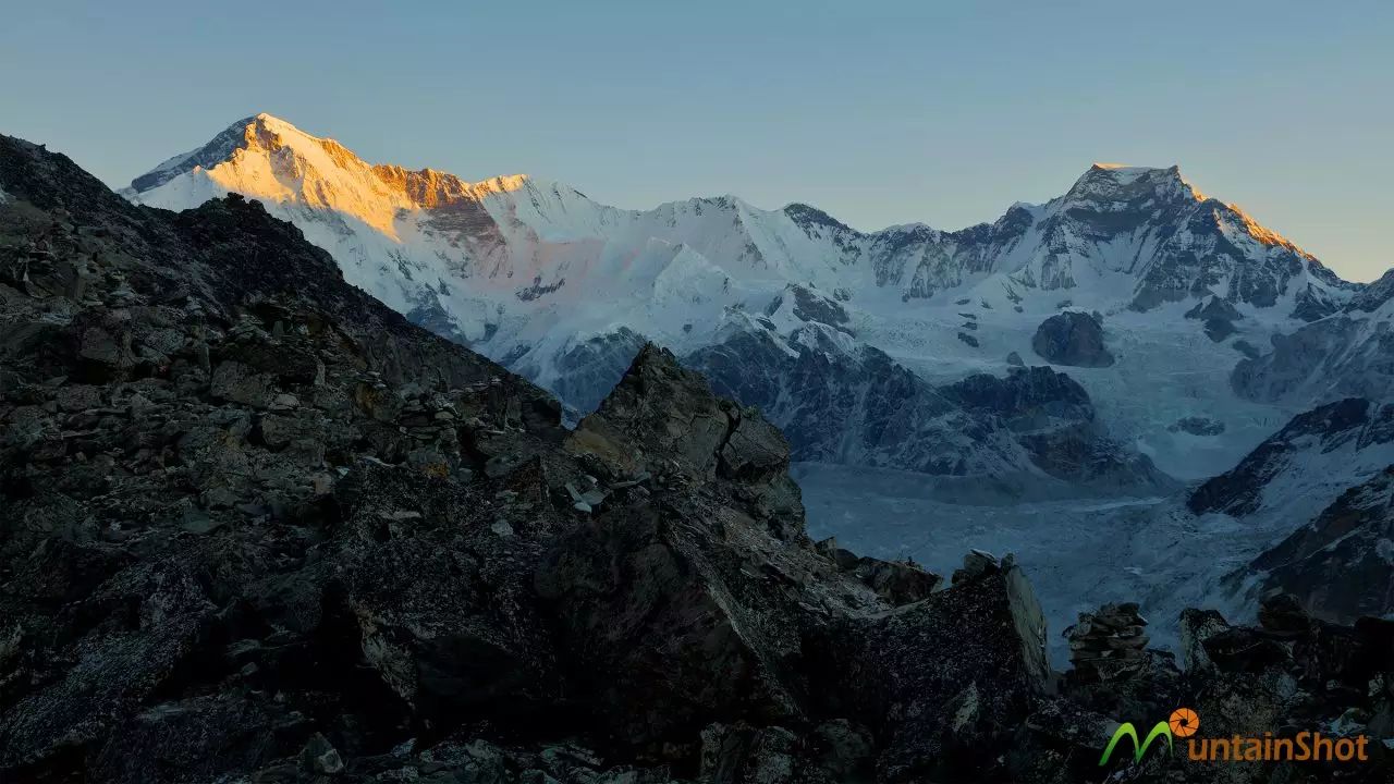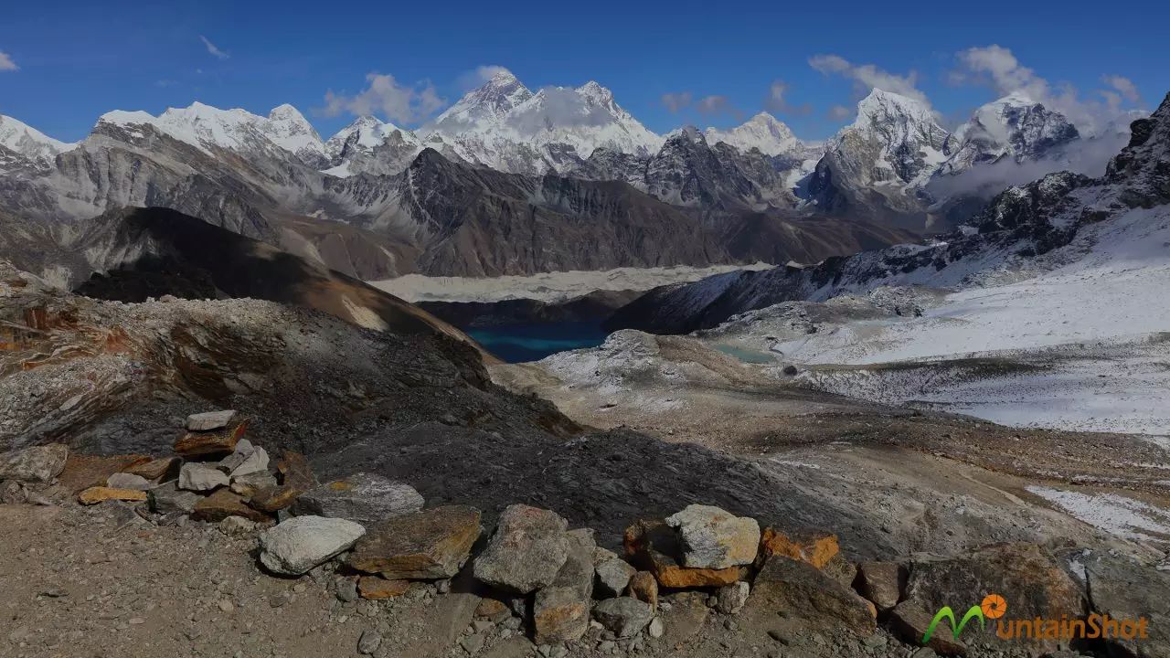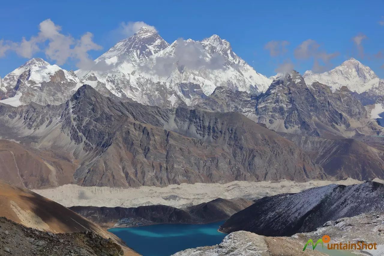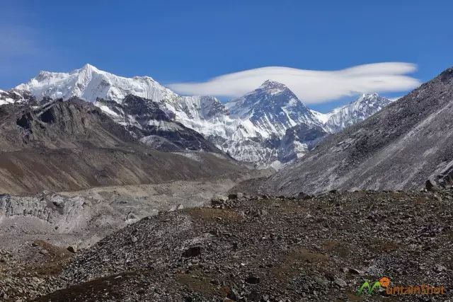 来Gokyo的人,一般都会去Sagarmatha三大观景平台之一的Gokyo Ri,但这个难度超过Kala Pathhar的观景平台再次让我有点失望,因为卓奥友的一大半身躯都被前面的山体遮挡了,不过格重康倒是看的很真切了。需要重点说明的是,在Gokyo Ri上面是可以看到马卡鲁的这也是这座世界排行第五的山峰第一次登场。