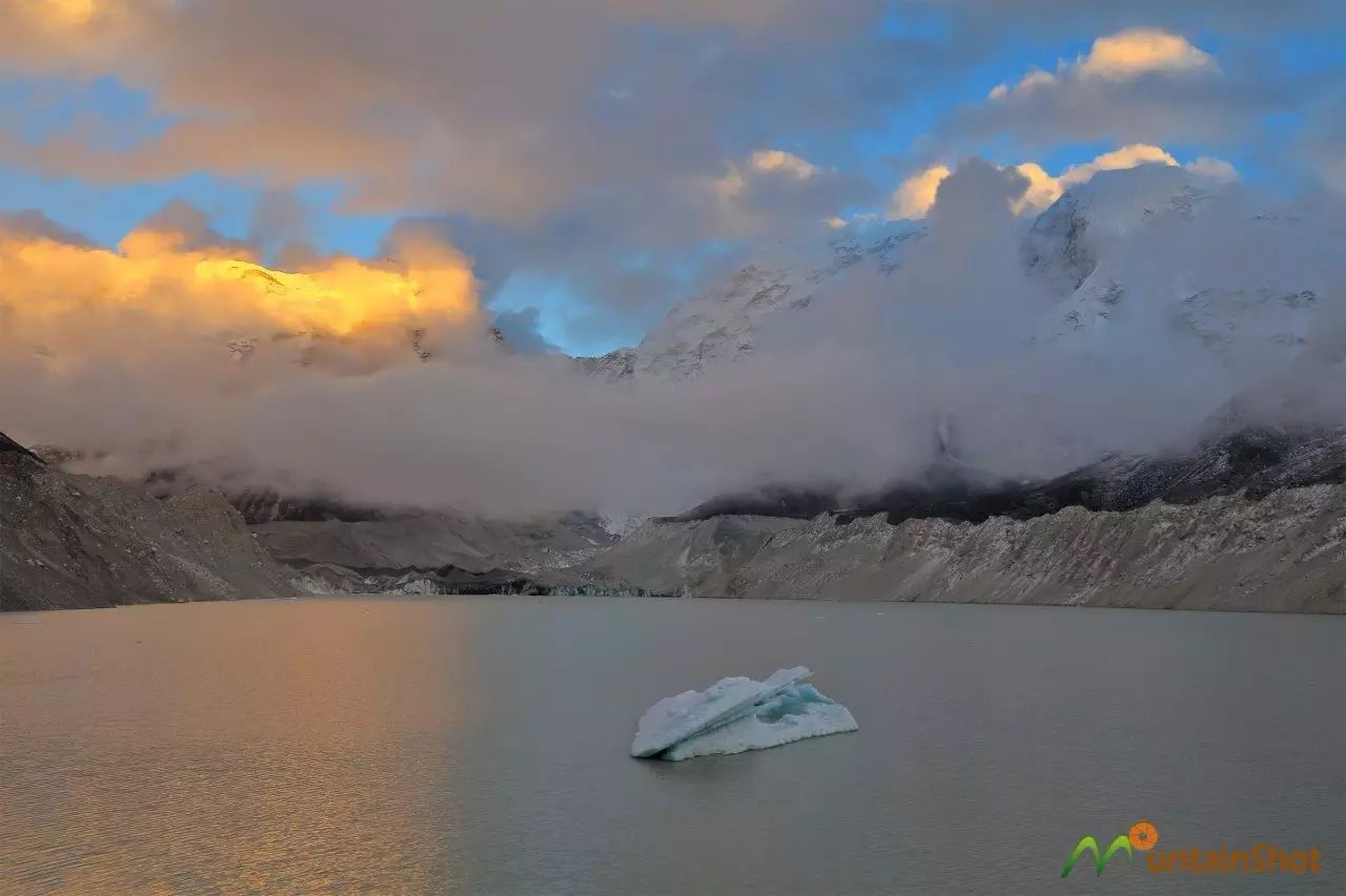 下图为Num Ri\努姆日(左)和Baruntse\巴伦侧峰(右)下的冰湖IMJA TSO,一块巨大的蓝冰浮在水面,半江瑟瑟半江红。