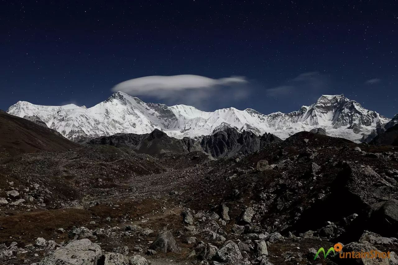 (夜空下的Num Ri\努姆日和Baruntse\巴伦侧峰↑)