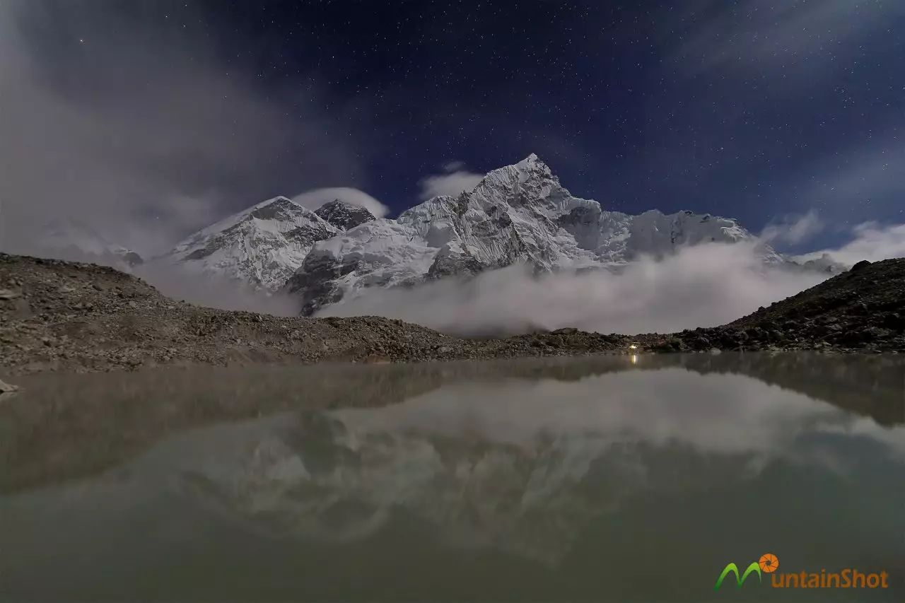 在这里看珠峰的角度也比较正了,但由于海拔较低,还是只能看到一个山尖。夜幕降临,云雾涌动但难掩繁星点点,湖对面的光亮发自登山队员的帐篷。
