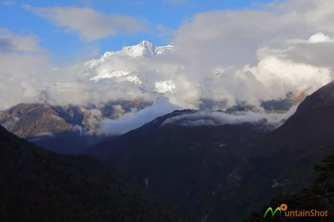从Tyangboche向西回望,照片中的村落就是NamcheBarzar,而Number南布尔雪山则被云雾遮盖。