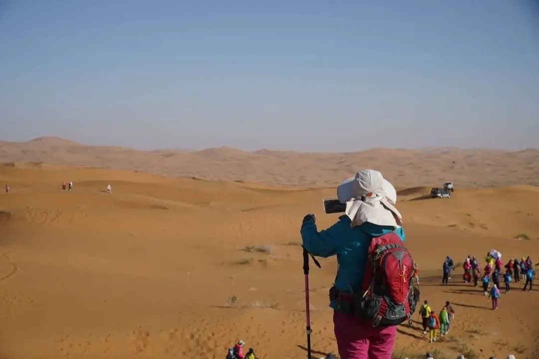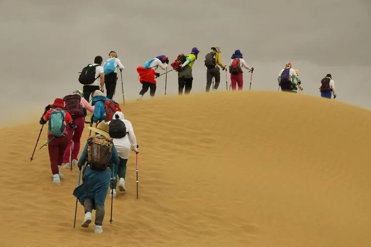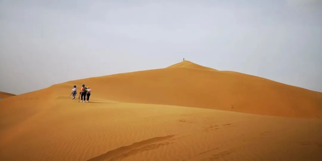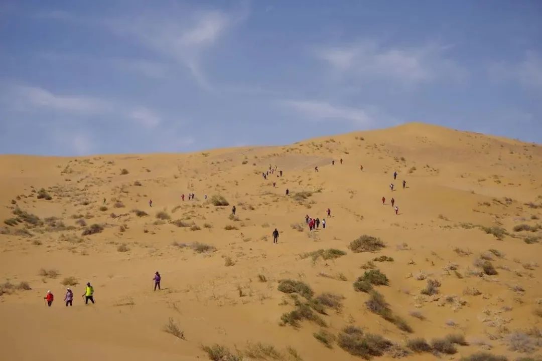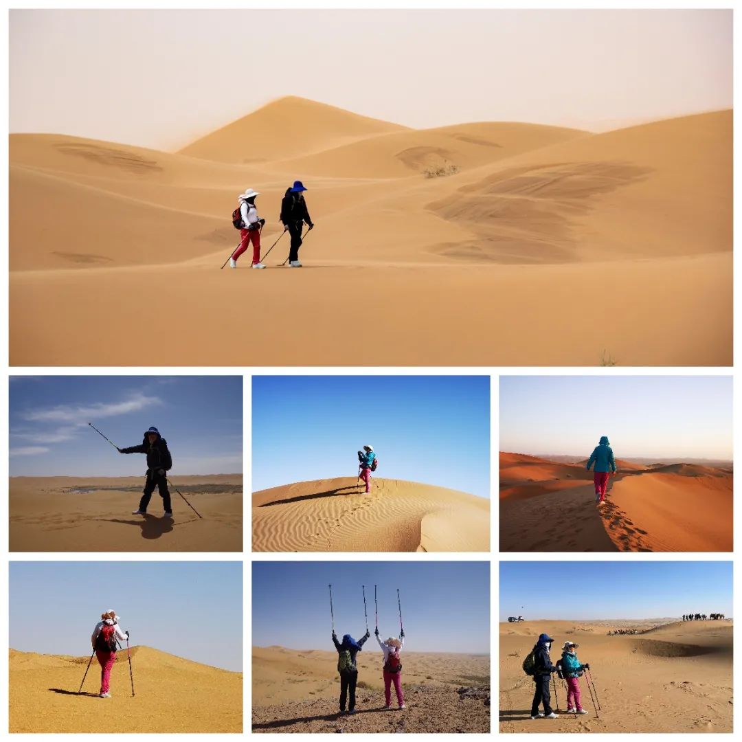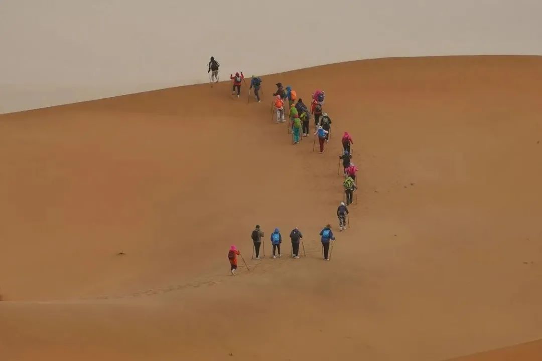 沙丘如海浪,起伏延绵,一浪高过一浪;沙山高耸陡峭,山尖软滑,走两步退一步,需要借助手杖和腰、腿部的力量,一鼓作气才能登顶。