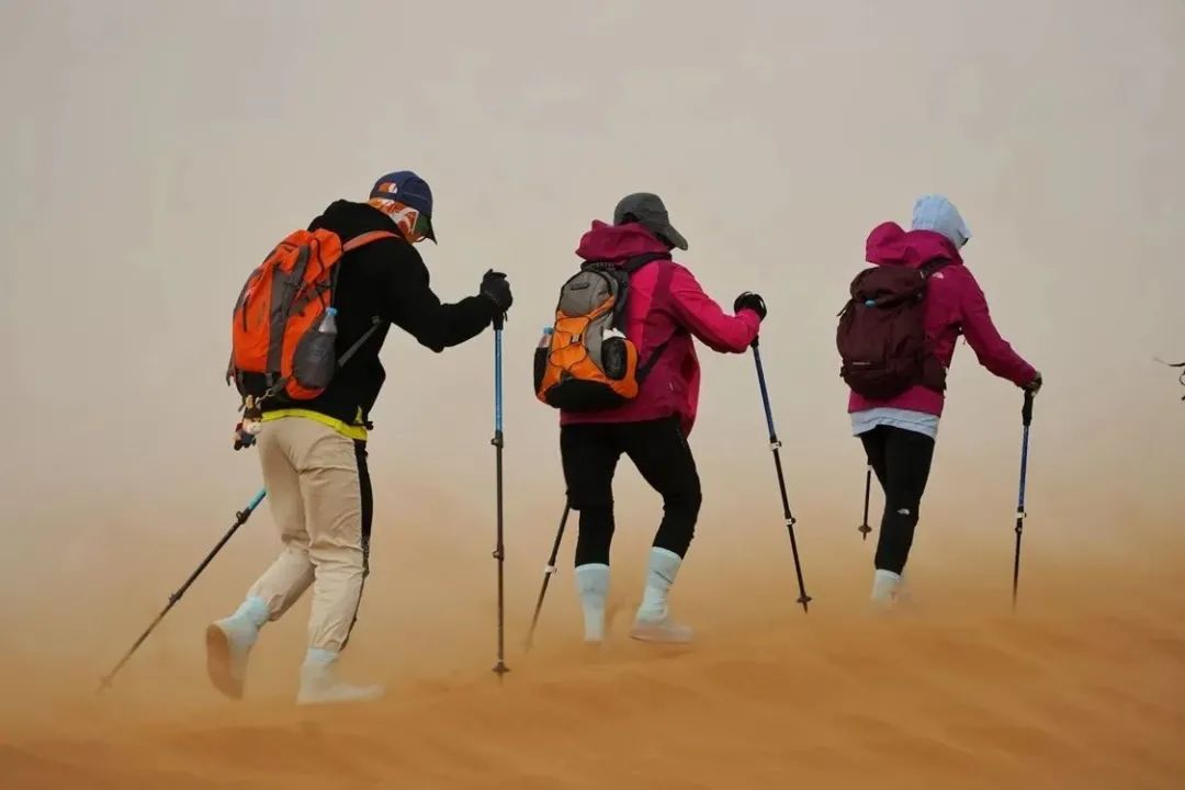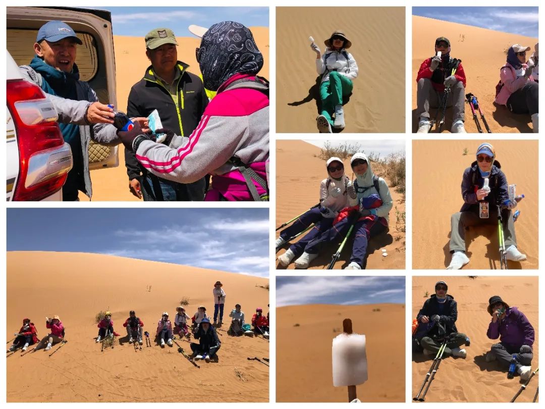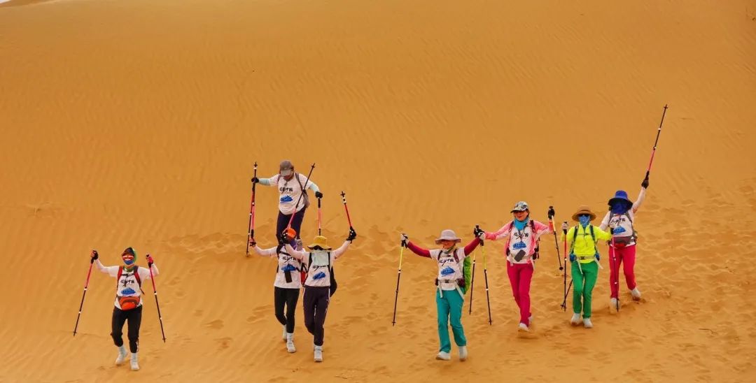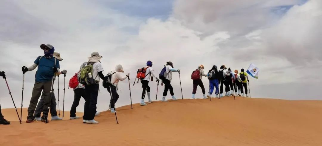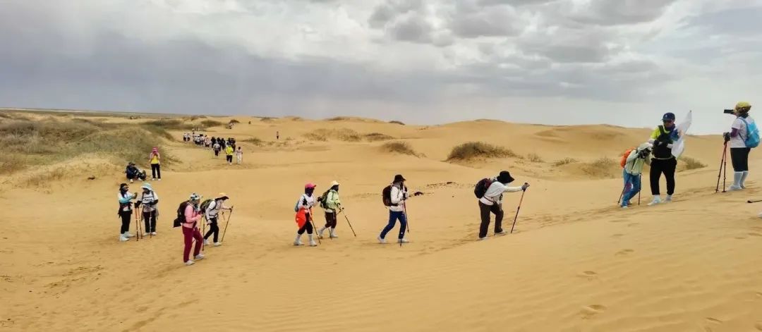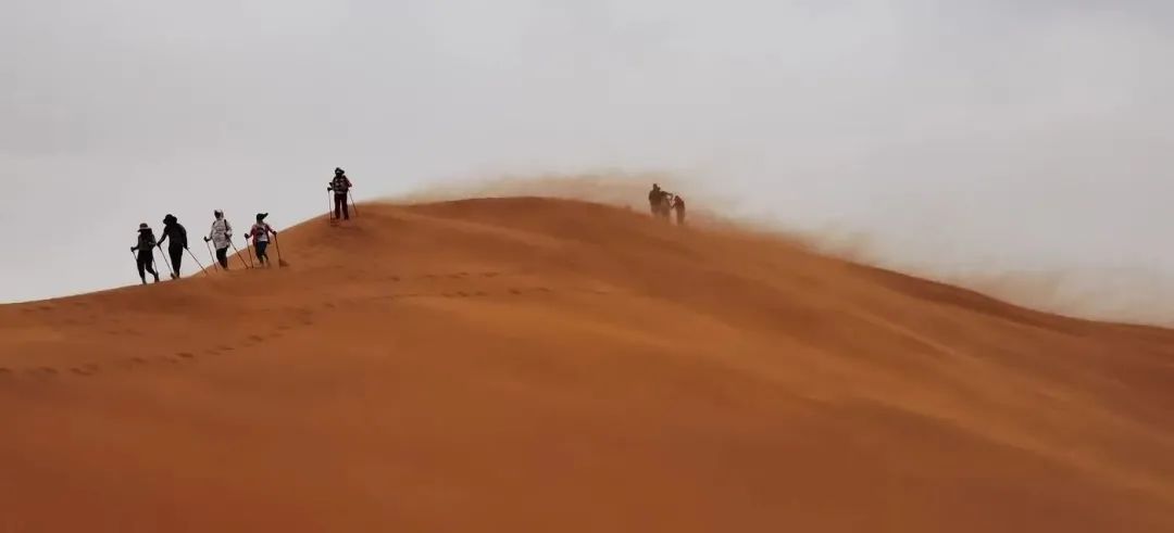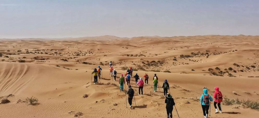 沙丘如海浪,起伏延绵,一浪高过一浪;沙山高耸陡峭,山尖软滑,走两步退一步,需要借助手杖和腰、腿部的力量,一鼓作气才能登顶。