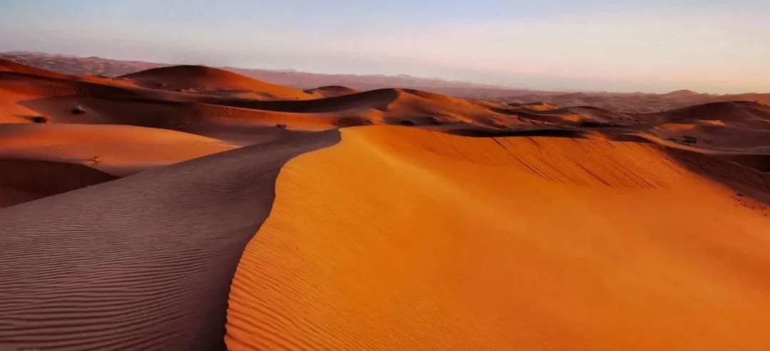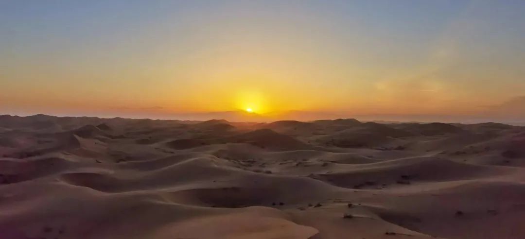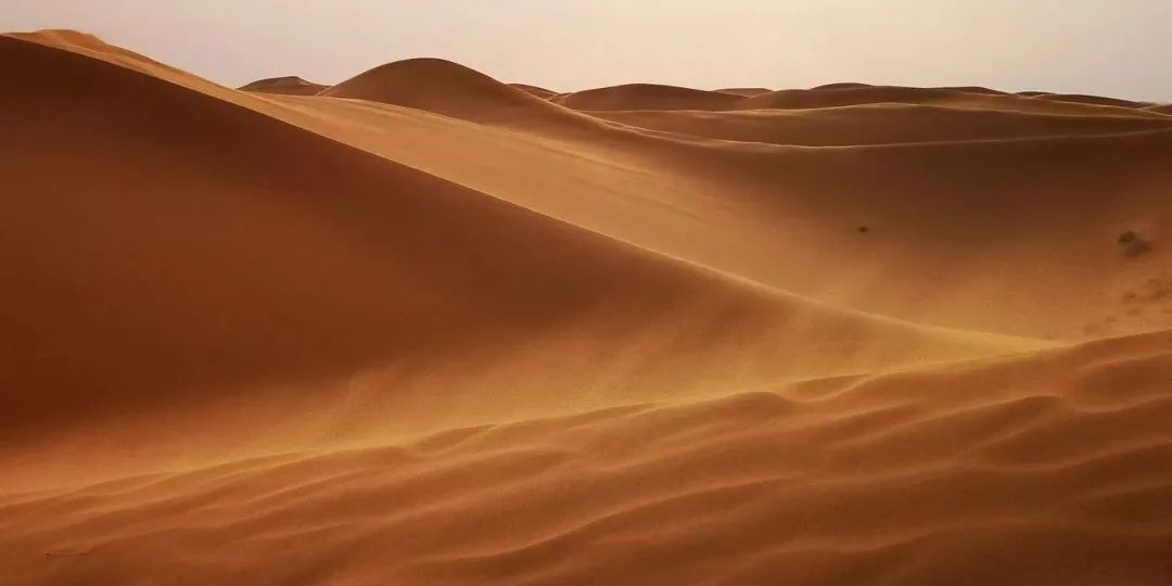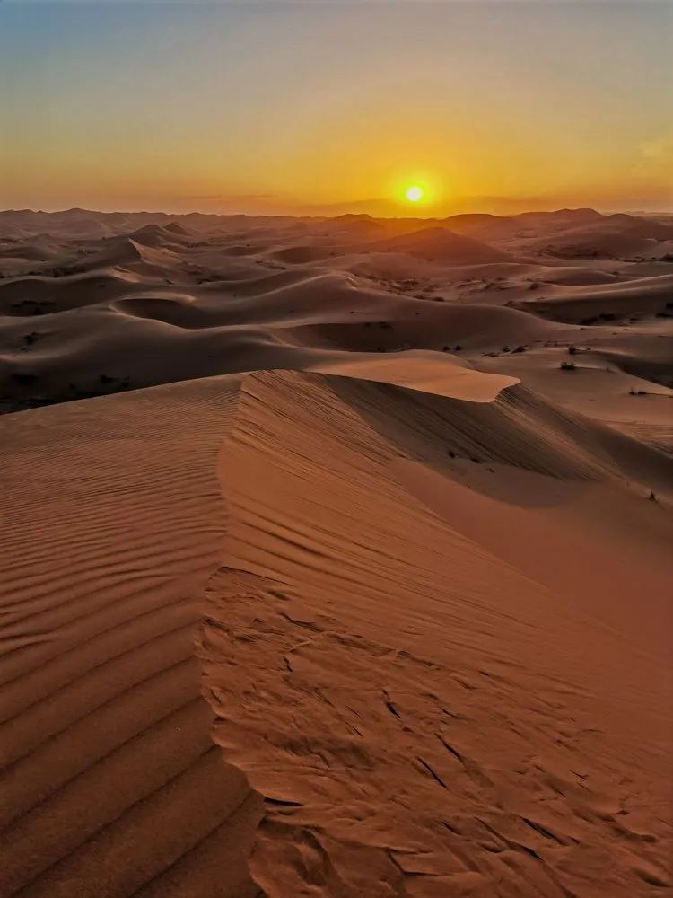 太阳冉冉升起时,霞光万丈,折射在沙面上,金黄一片。蜿蜒起伏的曲线,肌理明晰的褶皱,柔软细腻的条纹,天地广袤无垠—这才是我心中沙漠的模样。