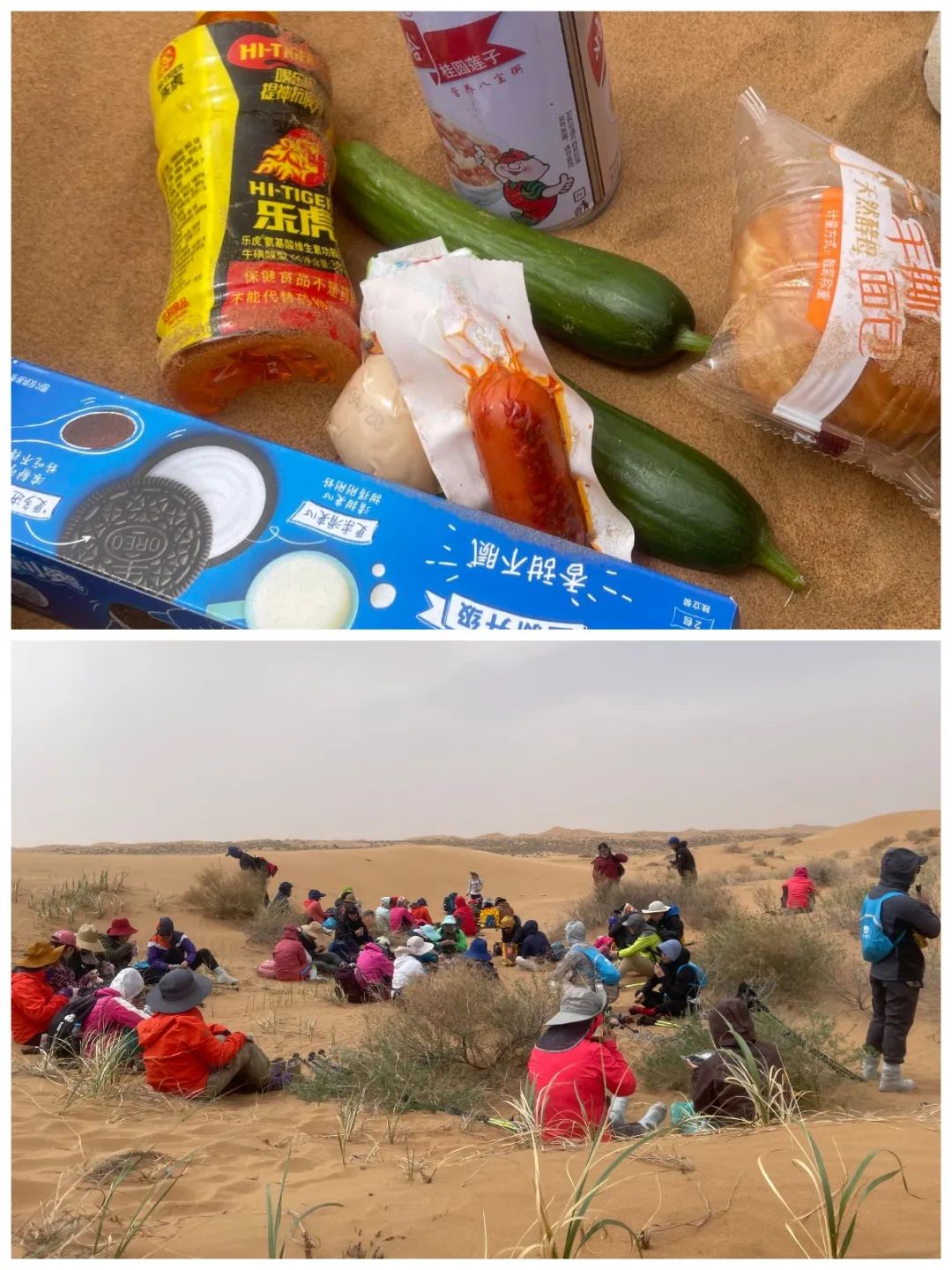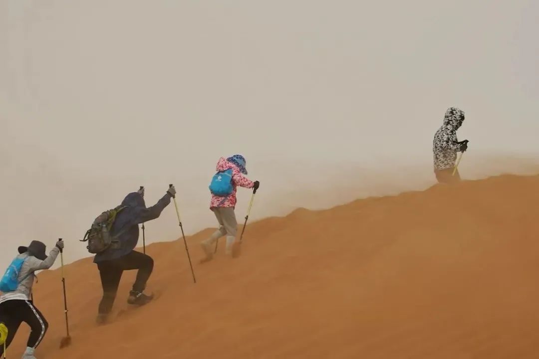 今天的风沙很大,为安全起见,组委会取消了原定的“定向越野赛”,四组有 7 人因体力不佳,和后勤团坐车到今晚的营地。7:30 ,顶着狂风飞沙,各组陆续出发了。