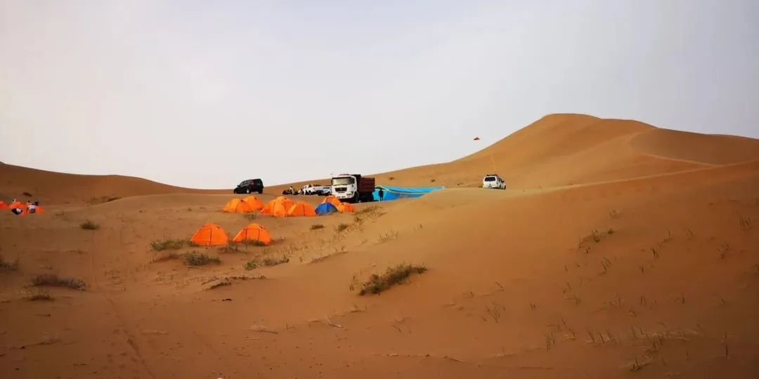 天空落下几滴宝贵的小雨,风也慢慢平息,天渐渐地蓝了,领队指着远处的沙山,说翻过那道山,就可以看到今天的营地了。