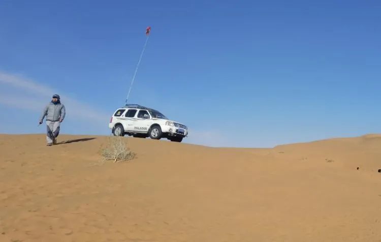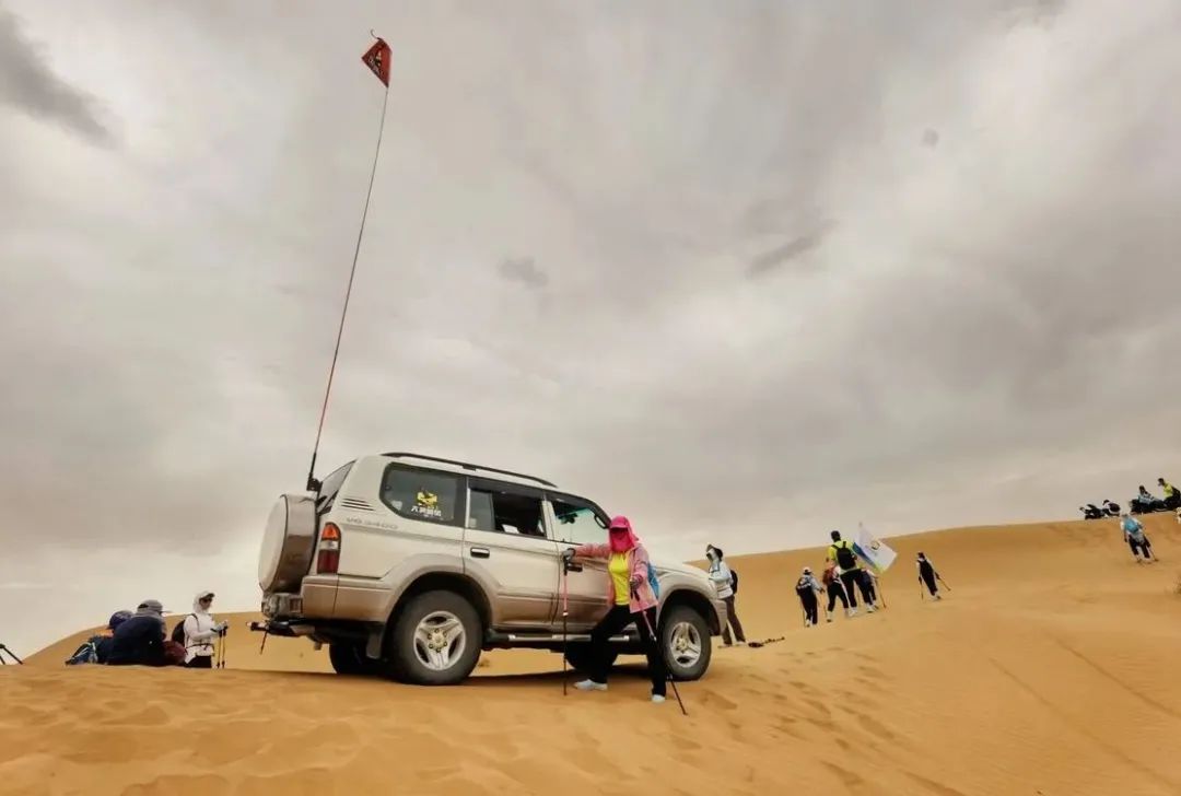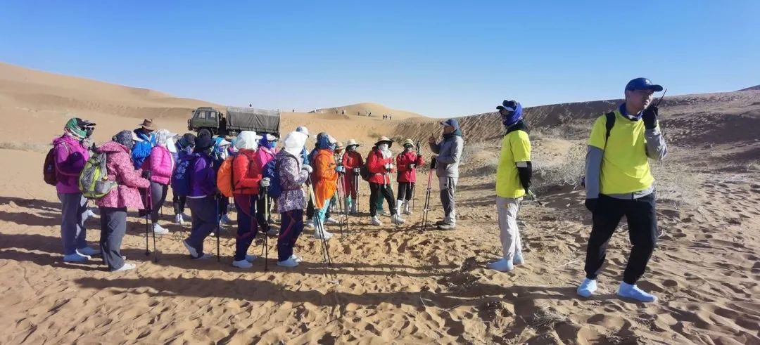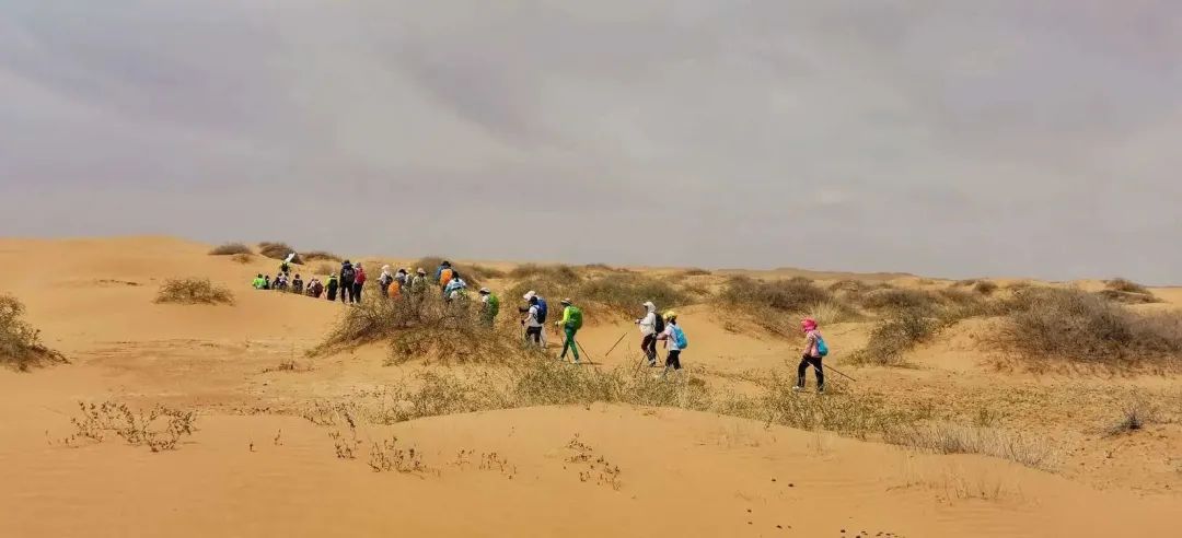 队伍在不断地拉大,领队不时地清点队伍,不让每一个队员掉队,后援保障车跟在队伍的前后左右,沙漠徒步,爱你不容易。