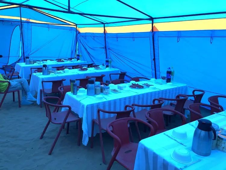 半夜时,风声大作,飞沙狂舞,帐篷左右摇摆,砂砾打在上面淅沥作响,像要被掀起的感觉,细密的沙粒一阵阵飞进帐内。空气中弥漫着沙雾,呼吸也不顺畅了,迷迷糊糊几乎一夜未眠。