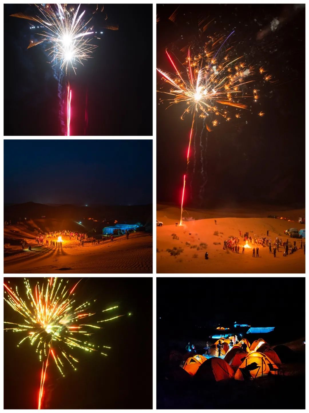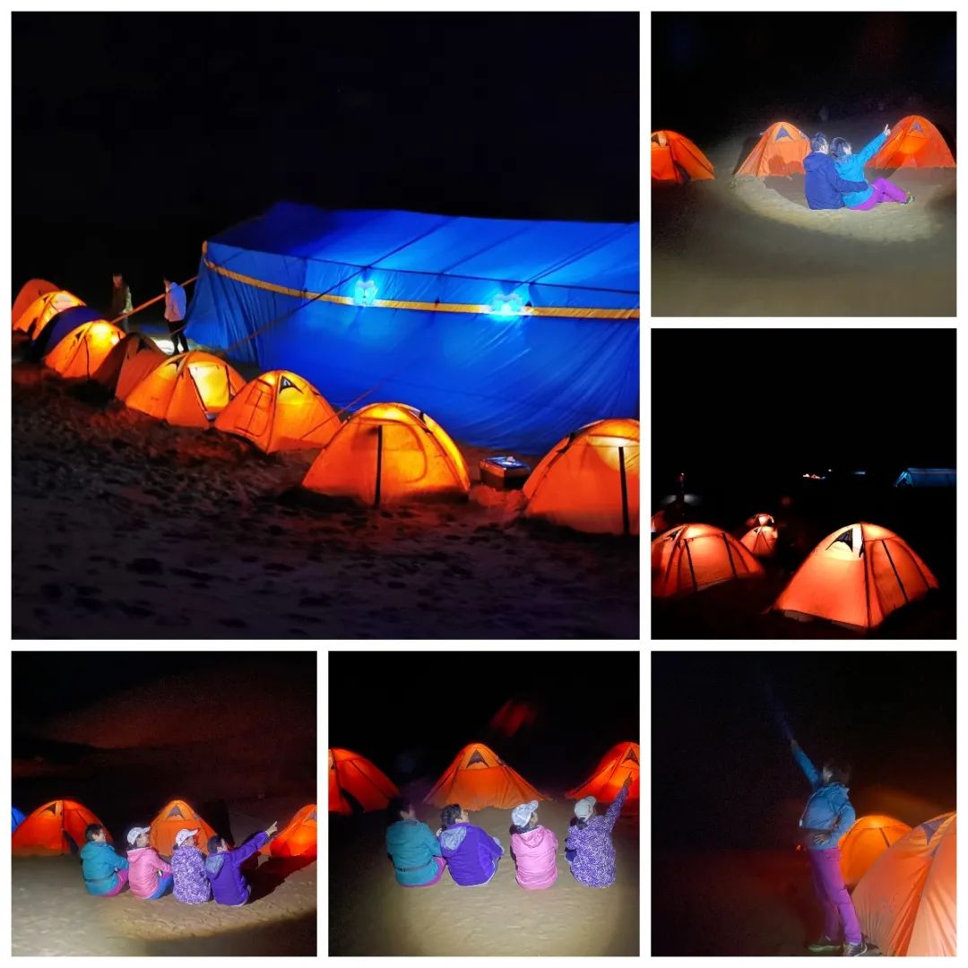 晚上的篝火晚会,高潮迭起,熊熊的篝火,璀璨的烟花,点燃了热情的沙漠。大家围在一起,唱歌、跳舞、做游戏。一位小哥哥唱的《我可以》太好听了,全场一起举起头灯为他打call,高声和唱“我可以,陪你去看星星。我多么想每一次的美丽,是因为你。”
