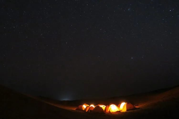 夜幕降临,风声渐息,天空已是繁星点点,架不住寒冷,大部分人直接躲进帐篷。我们几个人为了消食,在帐外秀了一把,以了沙漠看星空的心愿。