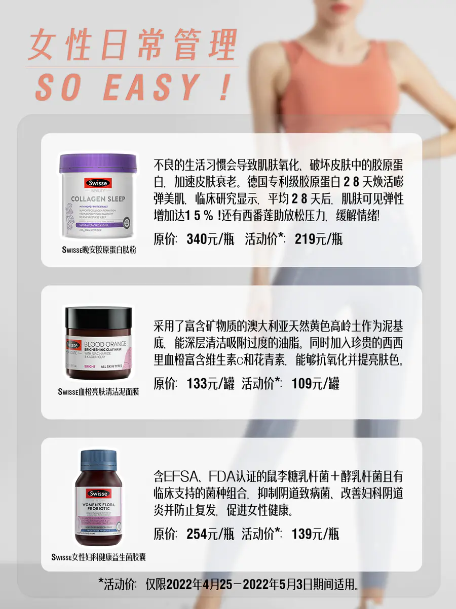 即467元(税前)得Swisse晚安胶原蛋白肽粉+Swisse血橙亮肤清洁泥面膜+30粒女性妇科健康益生菌胶囊