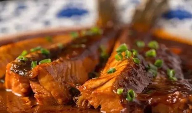 精选东钱湖野生青鱼尾段,改刀成型、先煎后烧,肉质鲜嫩,酱香浓郁。