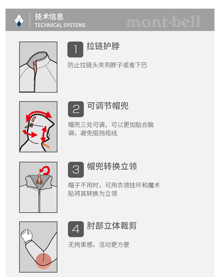 一直以来,Mont-Bell都是简约美主义者,所有产品均是尽量以最简单之线条作为设计主旨,所有设计均是以功能作导向,绝对不会为美观而加上任何不必要之装饰,一方面可以使重量更轻,亦使价目更为相宜。
