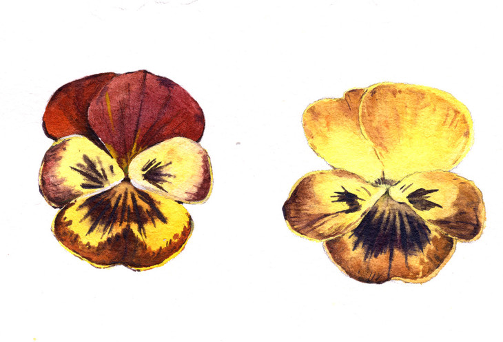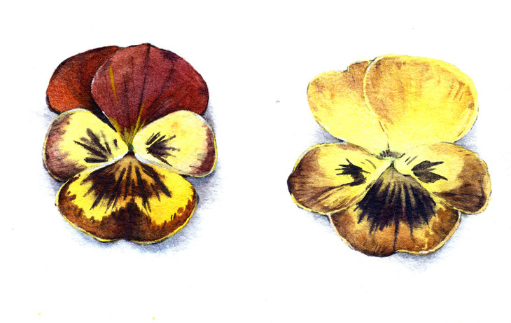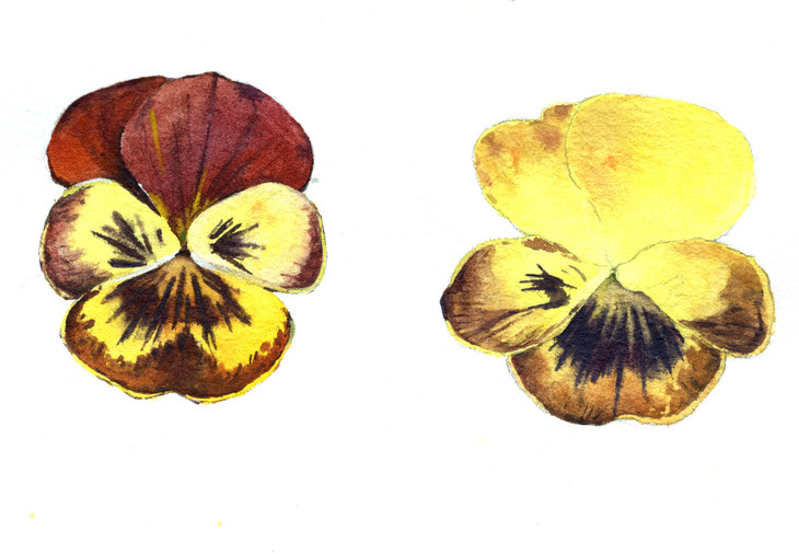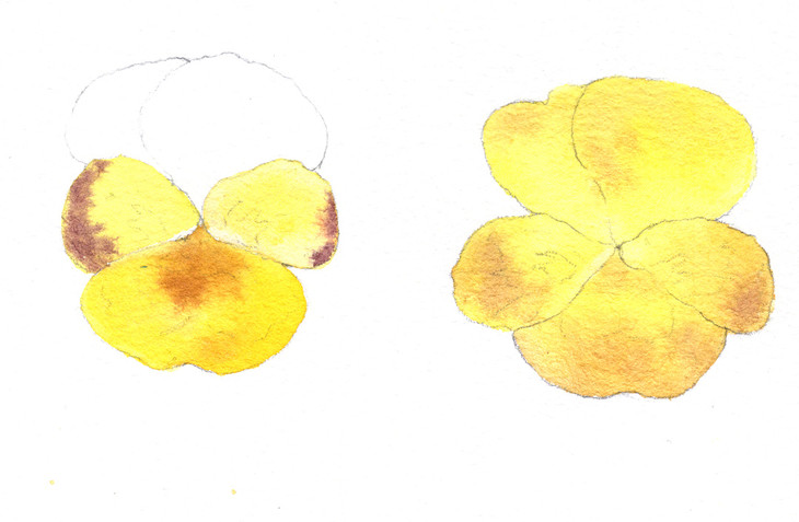 开始铺大色。用105浅镉黄和107镉黄混合大量水为花朵铺底色。趁画面湿润时点染少量188赤铁色和136紫色的混合色。