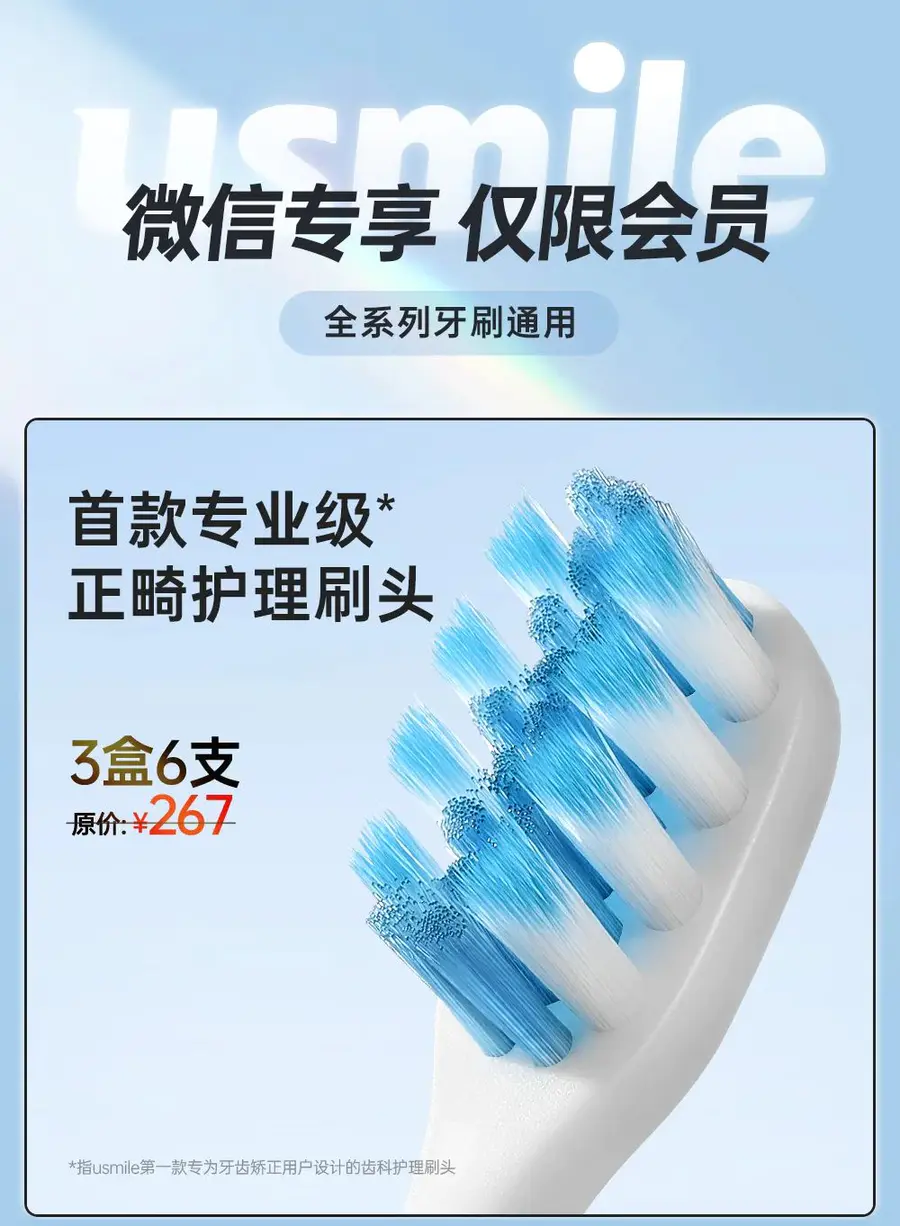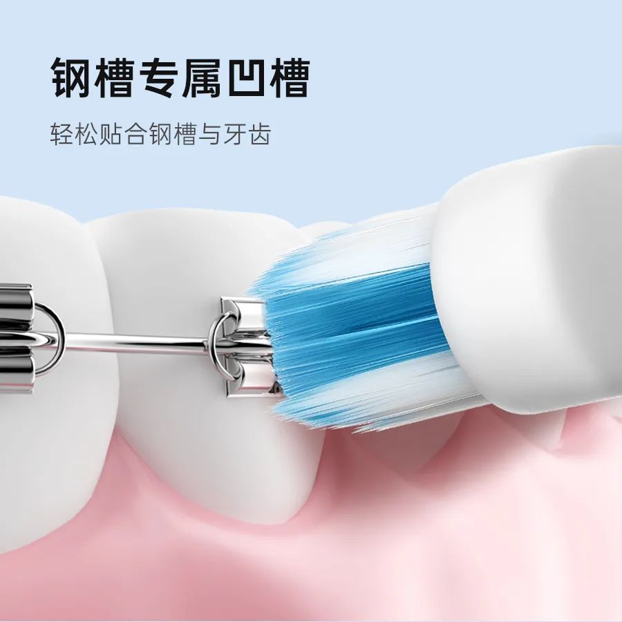 用正畸专用的刷头(可以绕过托槽的刷头),正畸刷头较小、刷毛偏软,中间刷毛比两边的短,刷面呈U刑,凹凸面有效清洁牙齿、矫正器托槽及钢丝上的牙菌斑。