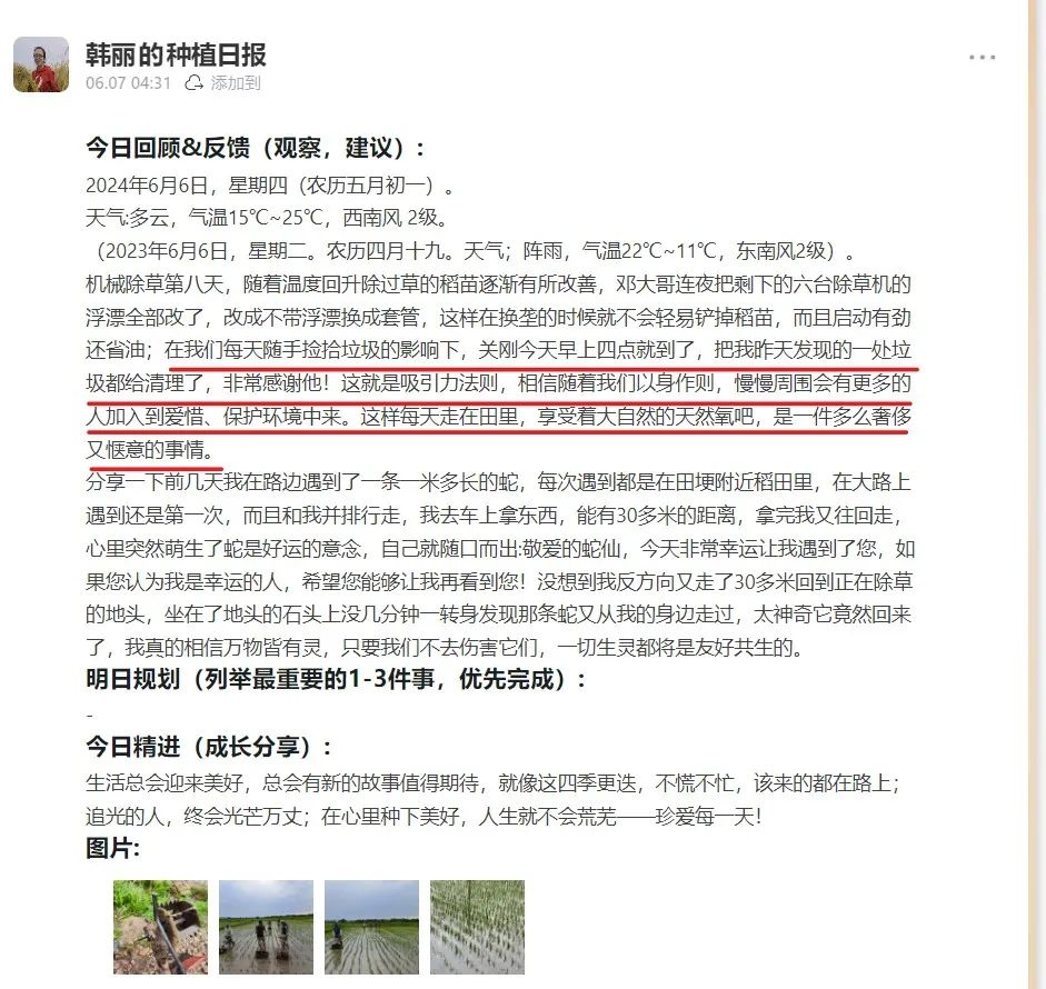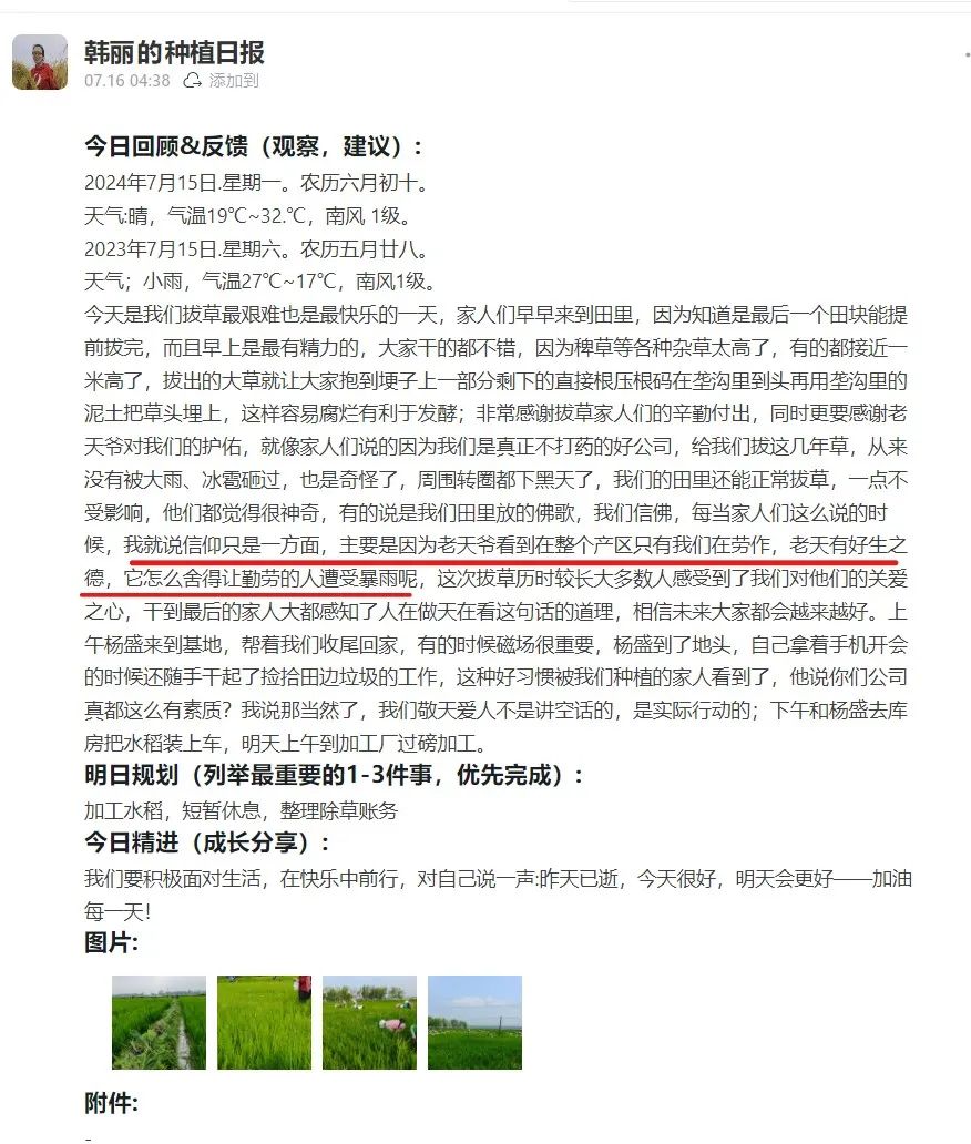 种植石板大米7年来,乡亲们对韩姐和伙伴们的态度,从最初的不信任,变成了敬佩,不少乡亲们也开始在自己的田上尝试不用农化种植,自己亲手去除草。他们说:“我看你们这么整,今年我也决定不打药,用手工除草试试”。帮忙拔草的乡亲们感受更加强烈:给别的地方拔草,不戴手套,手都“烂了”。在你们田里,就不会,而且田里的感觉很舒服。好多阿姨说:“我回家真替你们祈祷,祈祷你们公司越来越好,我们明年还能来拔草……”韩姐说,每一场收获都来之不易,所有的努力相信老天都看在眼里。