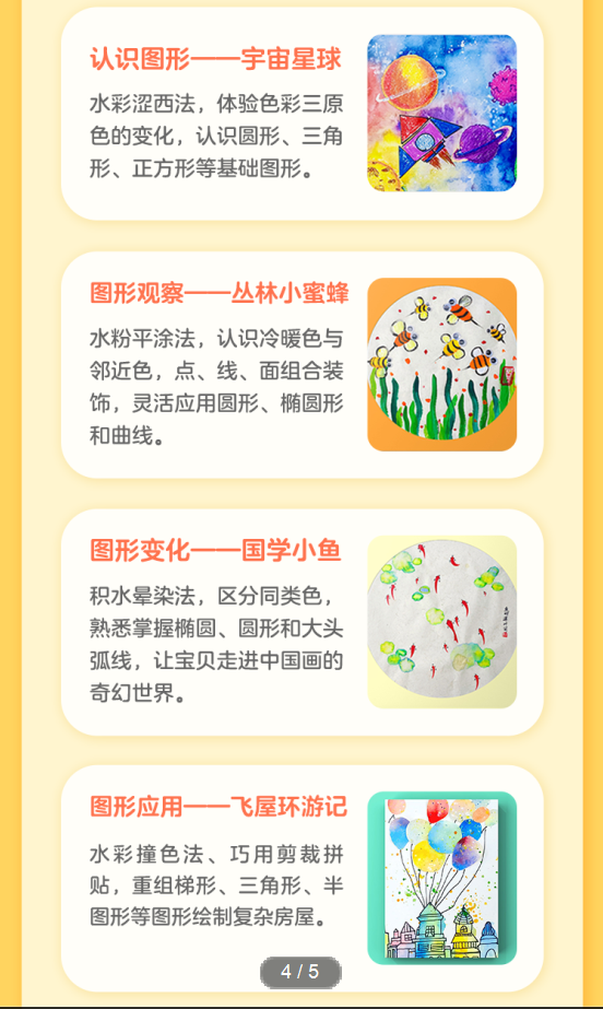 从认识图形,引用图形,观察图形到图形变化,图形应用,解决孩子不会画的难题,至少掌握四种色彩知识,5种绘画方法。