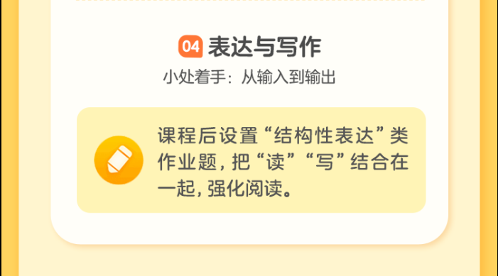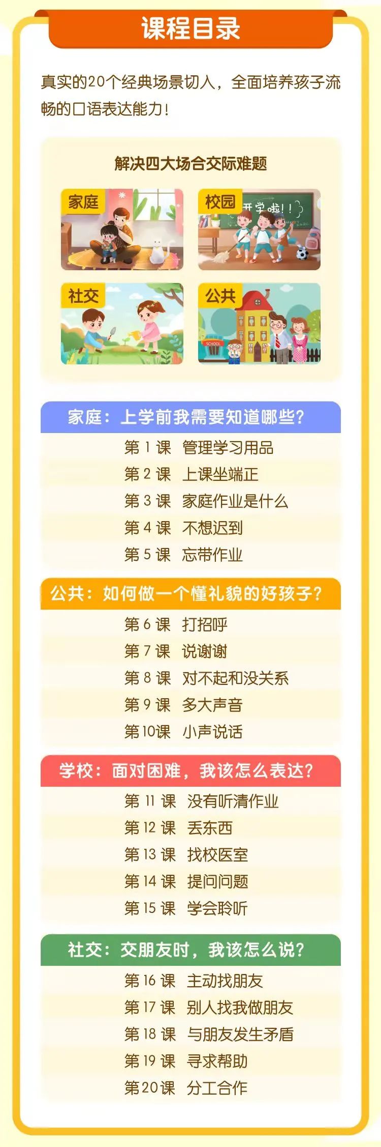 每节课分为四个步骤:情景引入,提问引导,方法讲解&知识延伸,情景模拟,课程讲解有趣生动,循序渐进地让孩子提升口语表达能力。