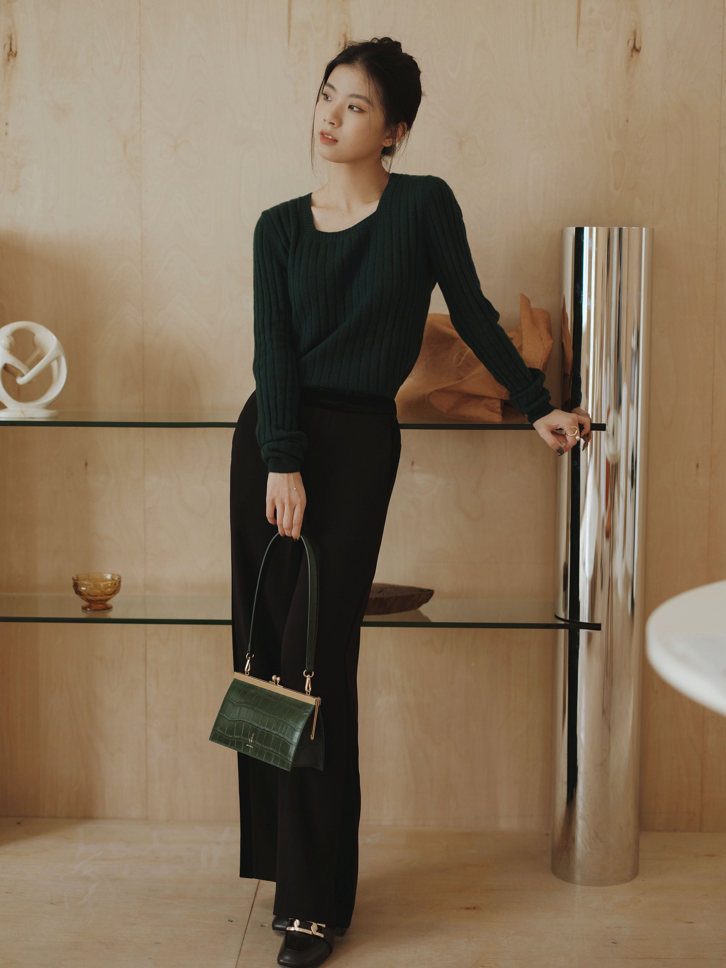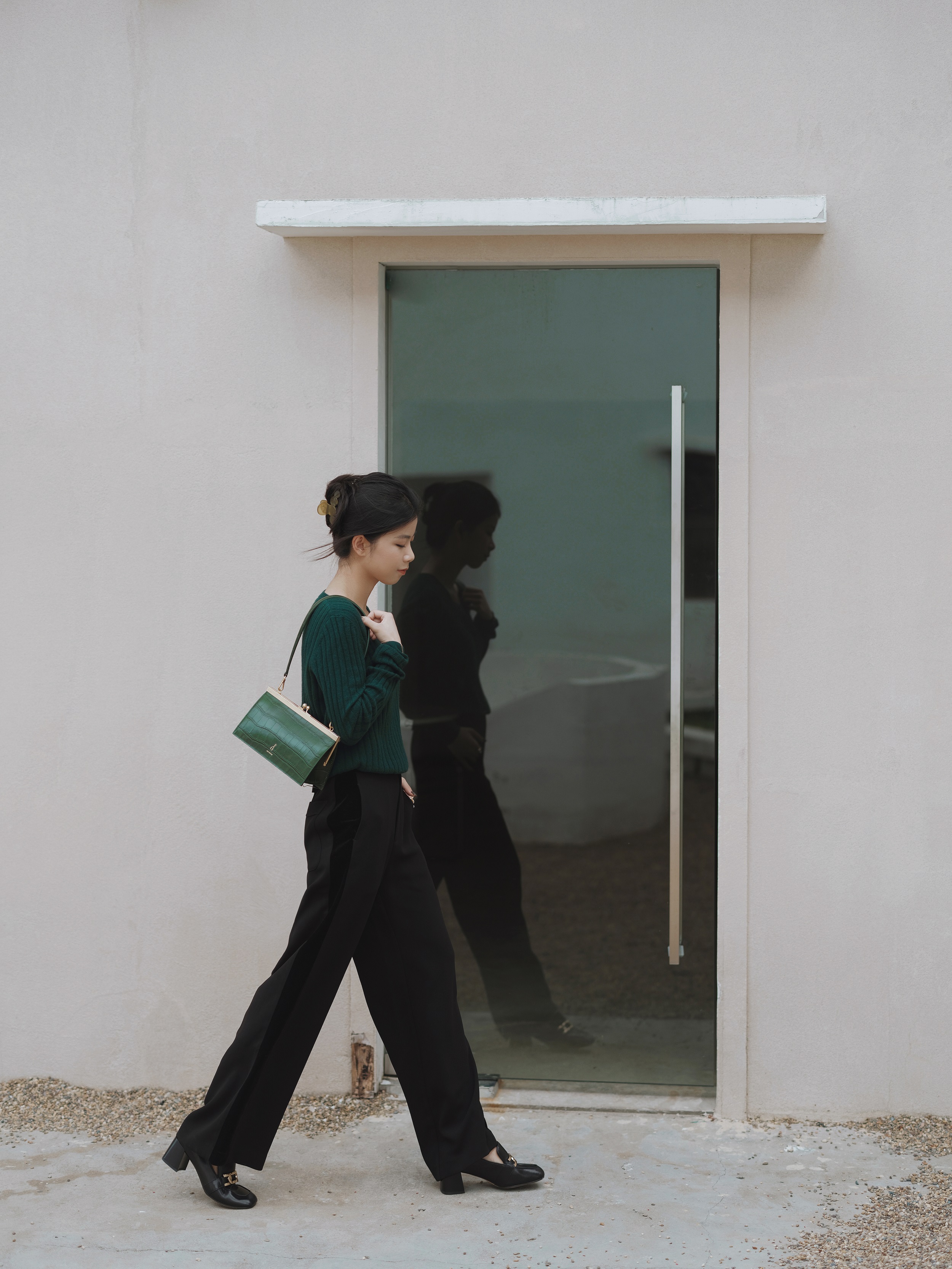 这抹绿色太显白了,穿上优雅有气质又明艳大方。再冷些外搭黑色或米白大衣,加上一条经典又耐造的黑色三醋酸裤子,有九十年代那味儿了~鳄鱼皮纹包包也选了同色复古祖母绿,一抹金色跳脱出来,超级显贵