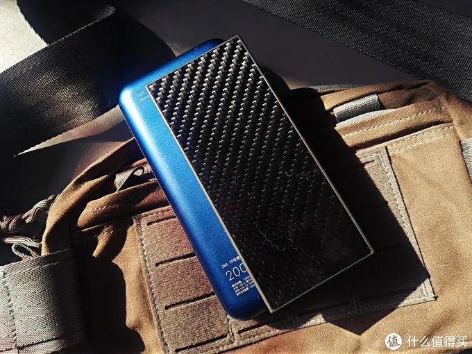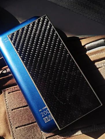 我把手里的两个2万容量的移动电源作了对比下。左侧蓝色的一个,右侧就是NB的NB20000。在外壳上NB20000没有像左边这款产品一样用铝合金的材质,而是采用碳纤维复合材料制造。