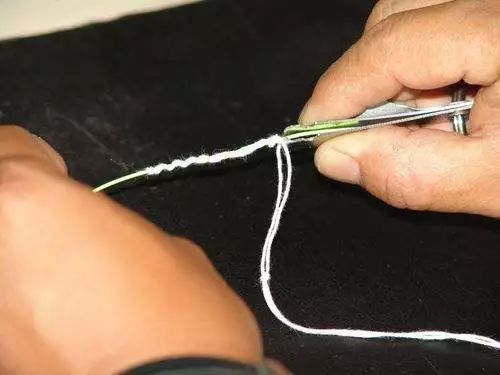 子线拉出来后,咬住线头拉一下,不要拉紧,然后转动钩柄上的线圈,将子线对着钩柄的内侧。不要拉着子线硬往钩柄内侧转,这样极易将子线打结的那部分抻撸,这副子线基本就废了。