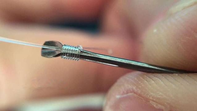 子线位置对准后,将线圈推向钩柄末端,再咬住线头抻一下,不要抻的太紧,太紧了也容易将打结部分拉伤。操作不当对子线的伤害比鱼对它的伤害更大。