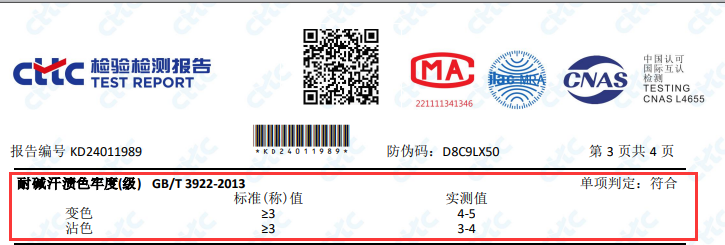 吸湿透气就算了,它的耐酸汗渍的色牢度也很高,变色和沾色的检测值均高于国家标准。