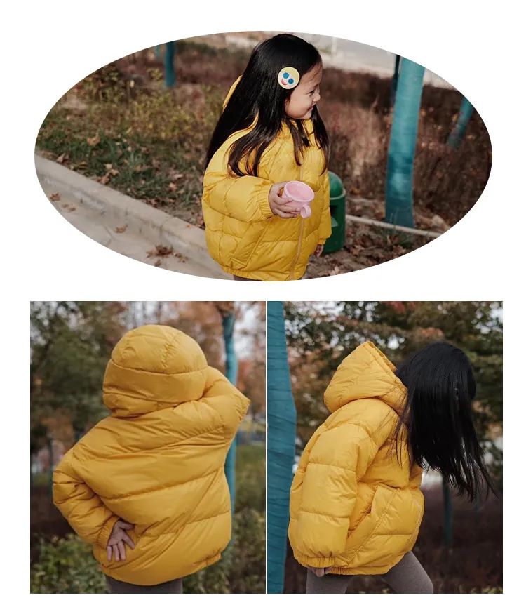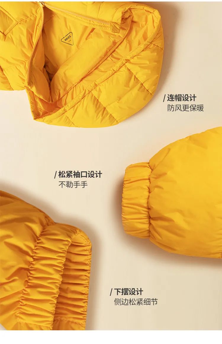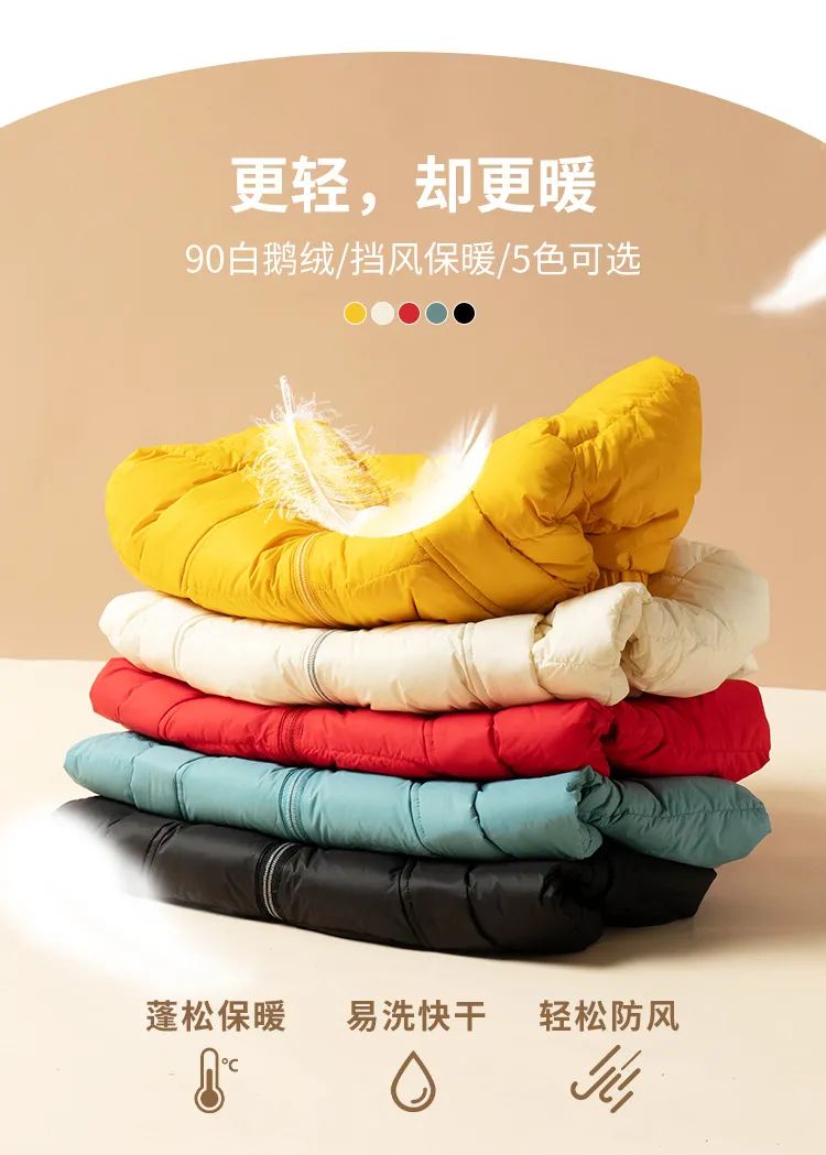 穿在身上非常轻便、温暖,衣服整体是短款的设计,穿上不会显得臃肿,方便活动。