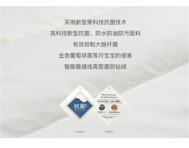 采用新型黑科技抗菌技术,高科技新型抗菌、防污面料,可有效抑制大肠杆菌,金色葡萄球菌对宝宝的侵害。