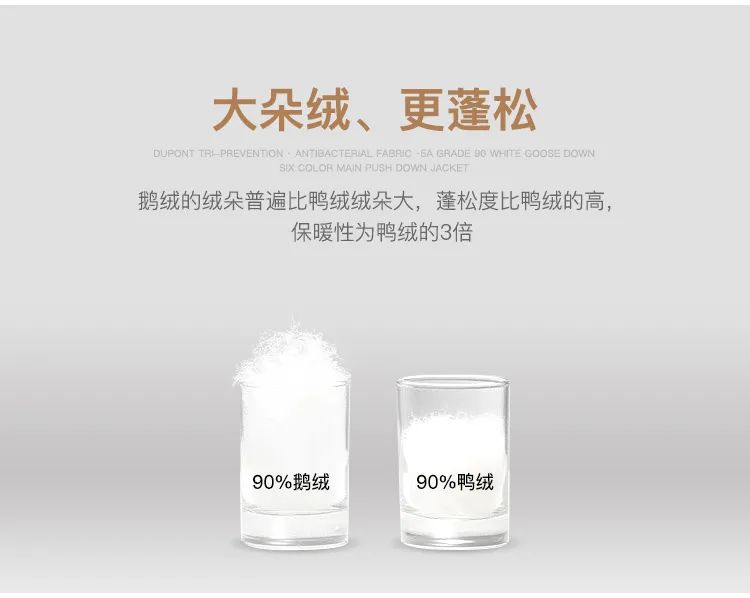 左边是鹅绒,右边是鸭绒。膨胀系数越高的羽绒,保暖能力越强。
