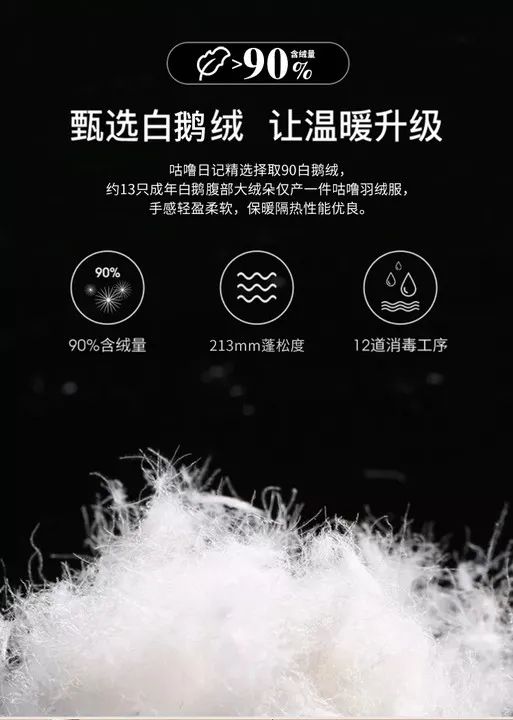 咕噜日记选用90白鹅绒,90%的含绒量,其中含绒量,即羽绒占全部填充物的百分比。