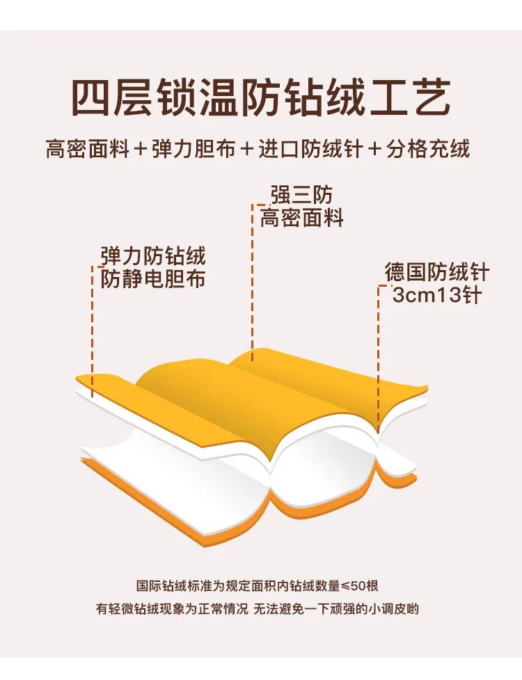 在拉链等连接部位,采用进口圆头机针和高柔韧度的高士线,进一步降低衣服钻绒风险。