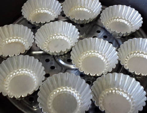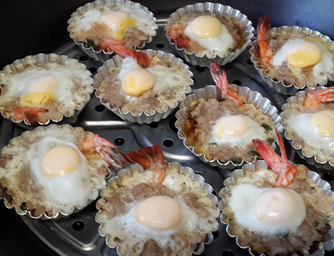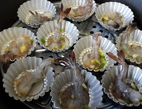 1、把腌渍好的虾放在匙勺或蛋挞托上面,虾肉朝下,虾尾朝上,把鹌鹑蛋打在虾肉中间,然后放在蒸锅里;