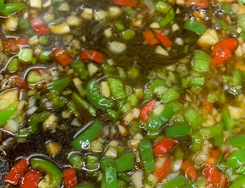 3、锅里留少许底油,放入葱花20克,姜末20克,香菜末20克,青红椒末各20克煸炒,出香味后放入1勺蒸鱼豉油,3勺水,2指1小捏盐,关火;