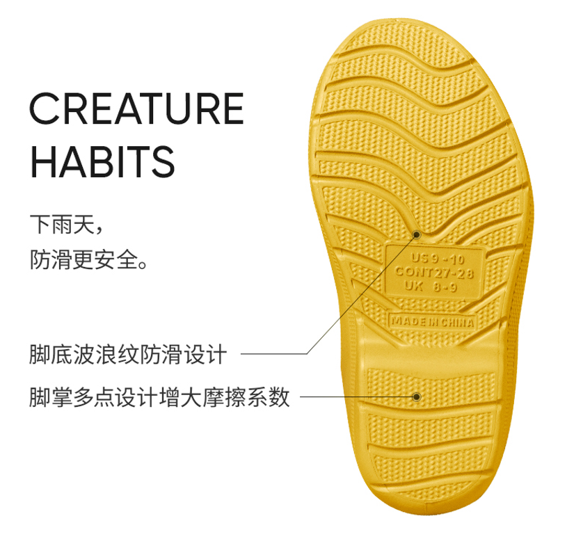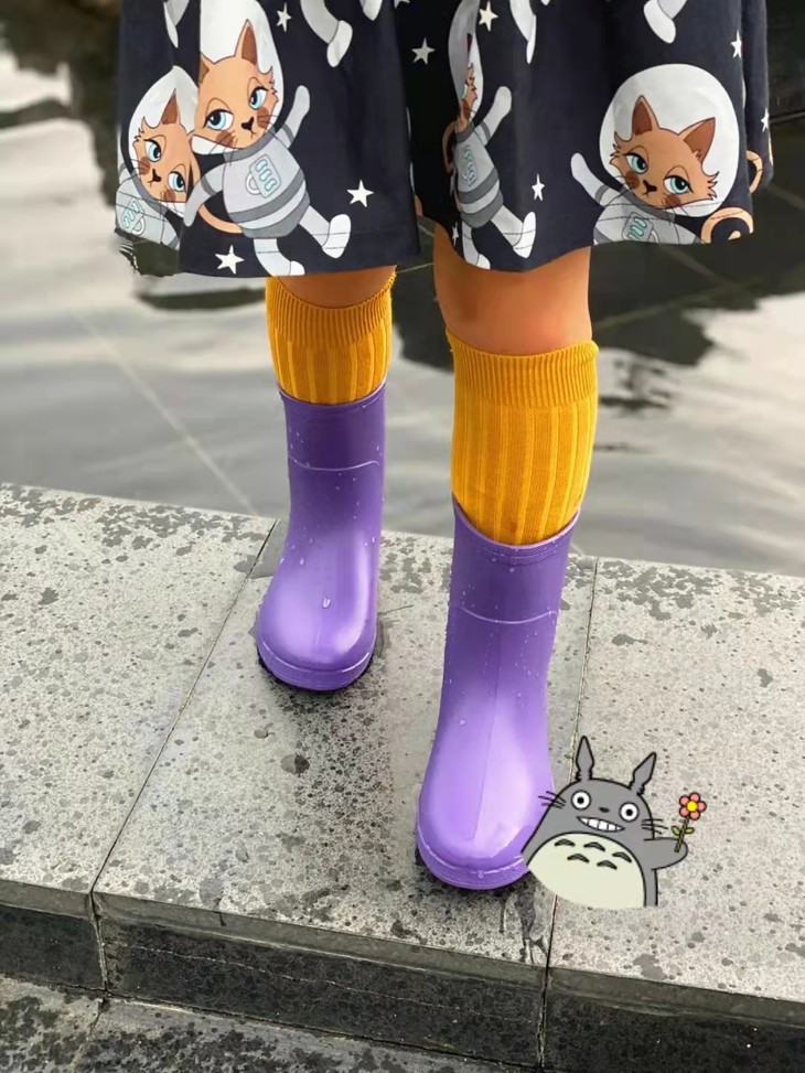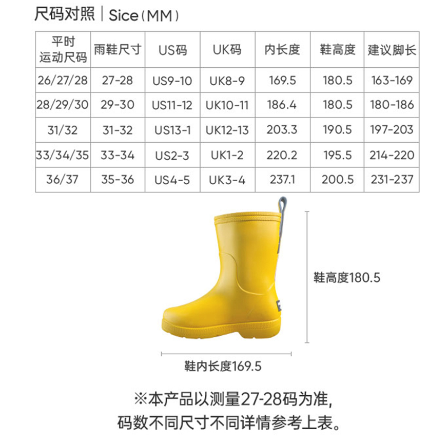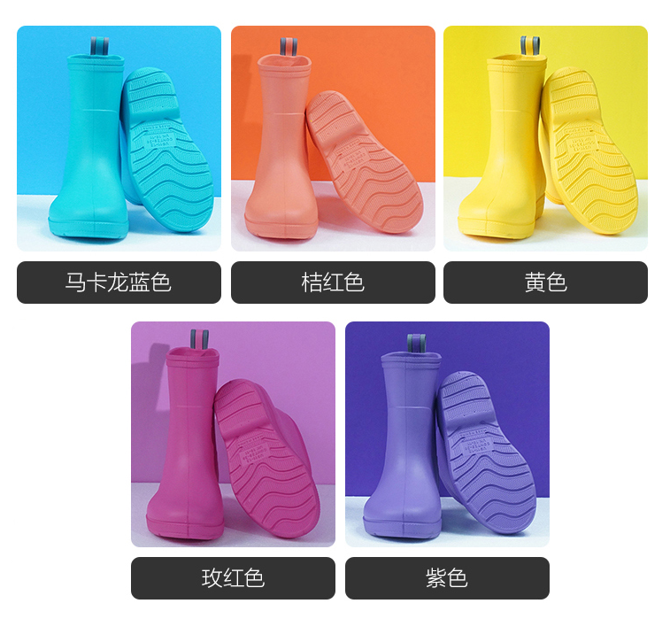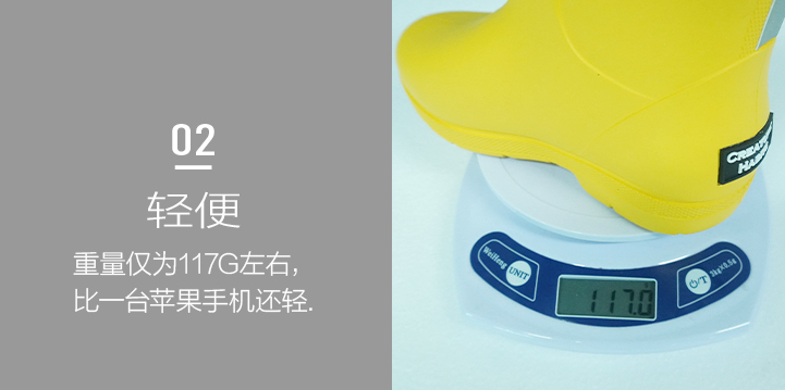 突破传统雨靴材质,选用和crocs洞洞鞋一样、橡胶+EVA的材质混制而成,天然地具有抗菌抗霉、防滑保暖的特性; 超轻!一只鞋还没有一只苹果手机重,穿起来毫无负担、轻松抬步; 雨靴筒高设计合理,高度在孩子膝盖下,既不妨碍运动,又能提供最大限度的保护;