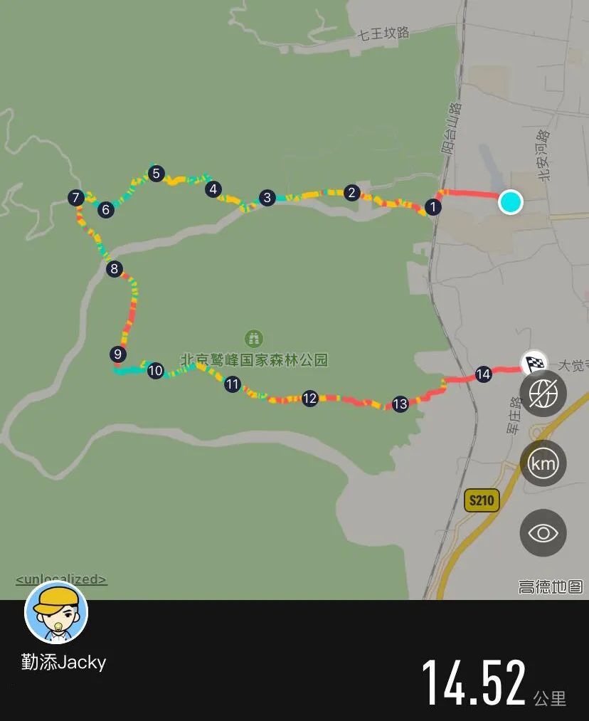 14.52km的登山徒步,累计爬升1088m,累计下降1025m,耗时7h10min,一路享受经典阳台山-鹫峰-大觉寺路线的风景。